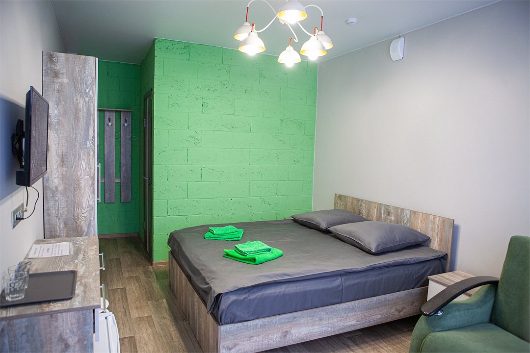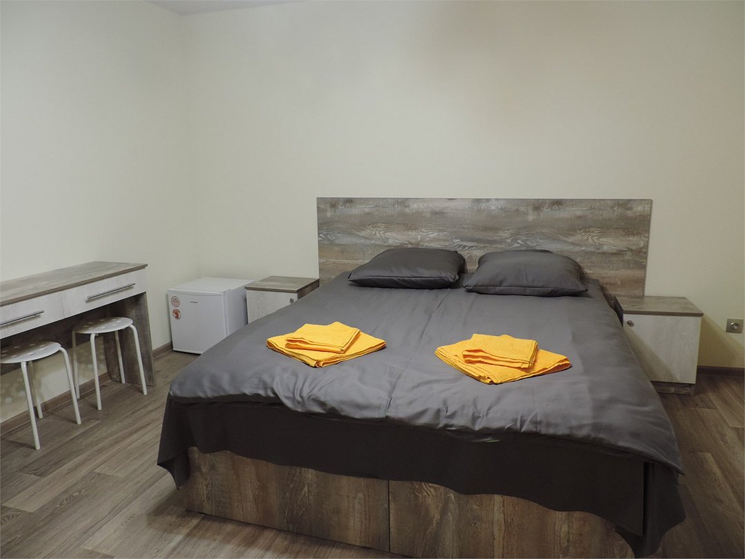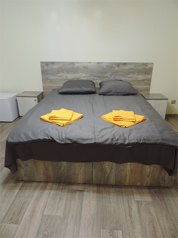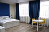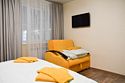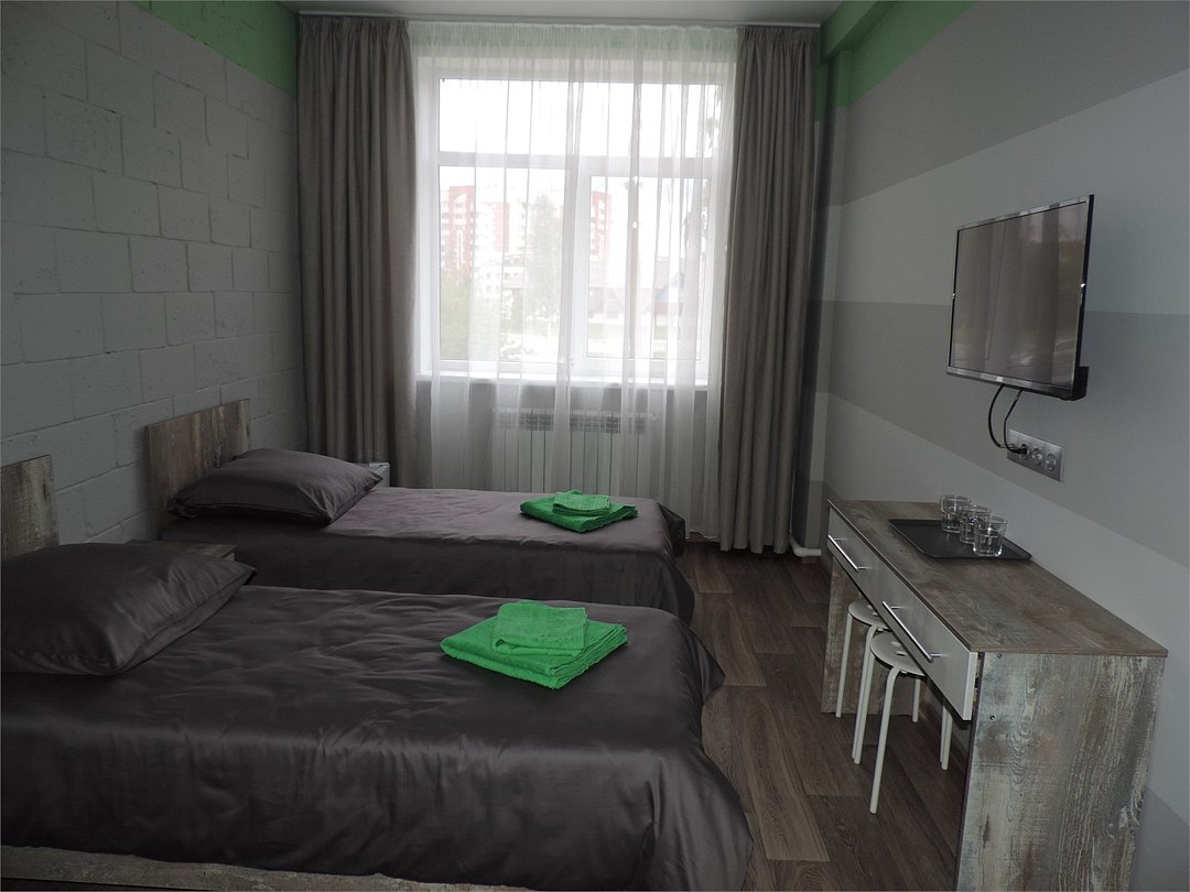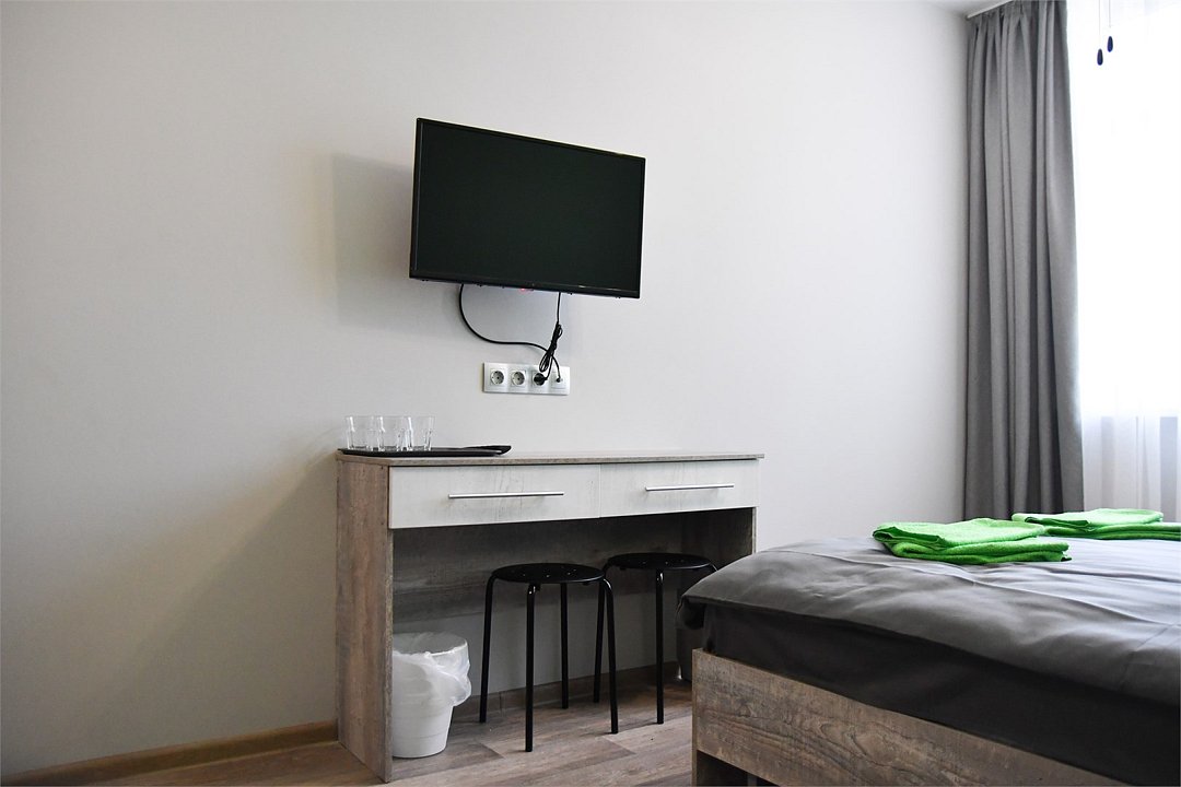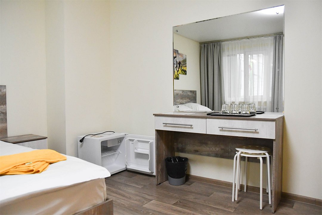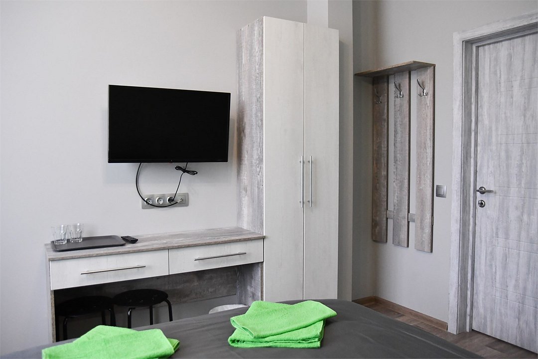 В двухместных номерах все расположено для уютного и удобного проживания. Интерьеры выдержаны в зелено-серых тонах, тонко гармонирующими со всей цветовой гаммой гостиницы. К услугам постояльцев имеется все необходимое: две кровати, которые могут быть объединены в одну общую двухспальную, две прикроватные тумбочки, холодильник, кондиционер, телевизор, с расположенный под ним TV столиком. Санузел располагает душем со стеклянными створками, унитазом, раковиной и зеркалом. В небольшой прихожей имеется вешалка и платяной шкаф. Две симпатичные табуретки тоже не будут лишними.Услуги и удобства