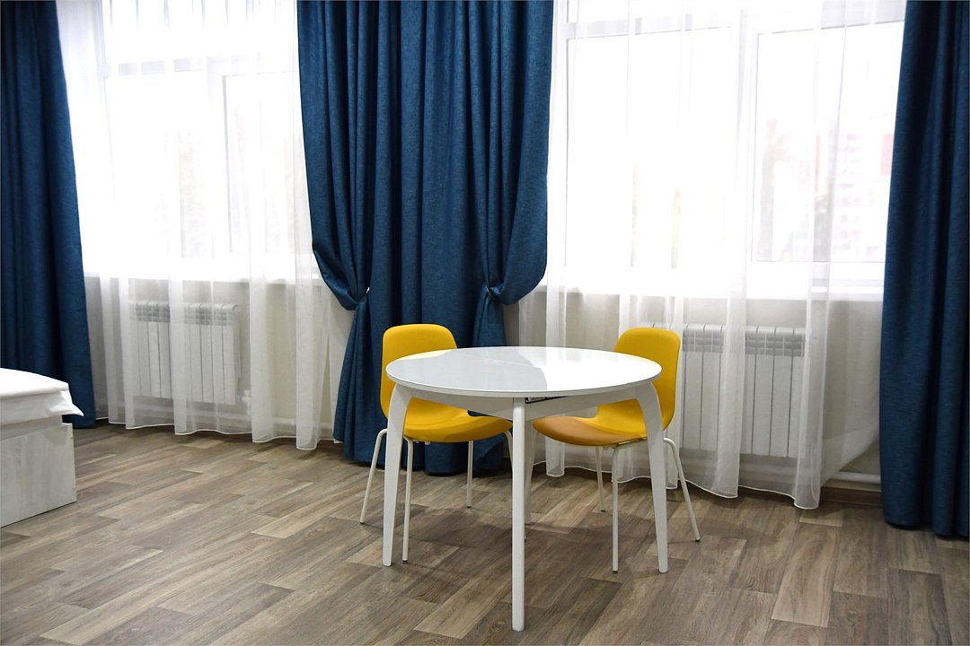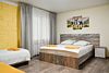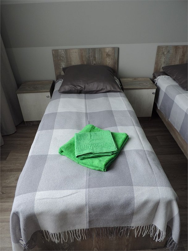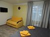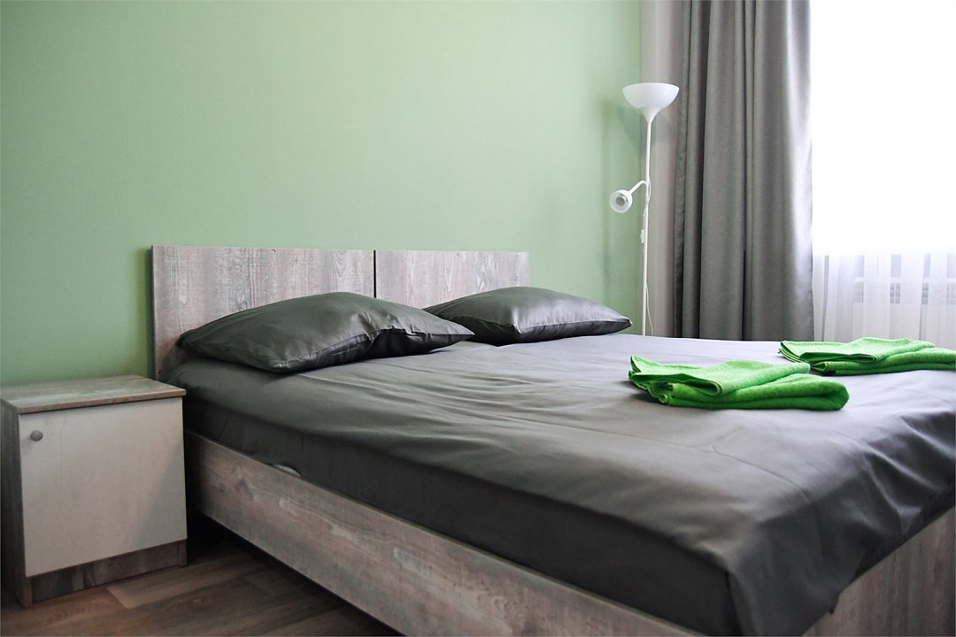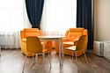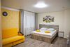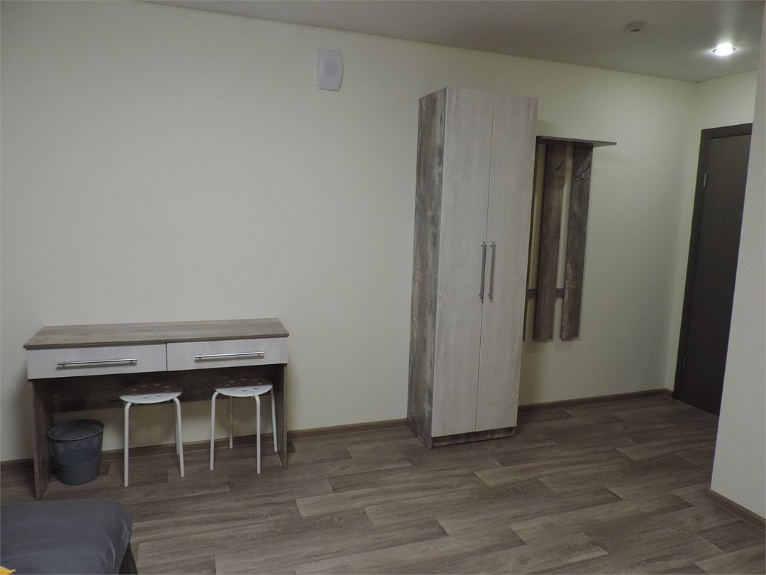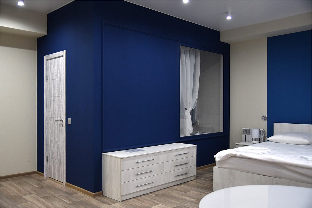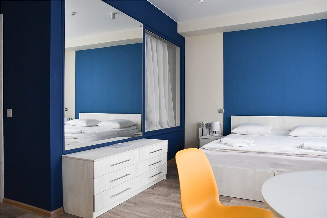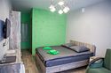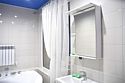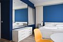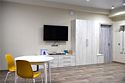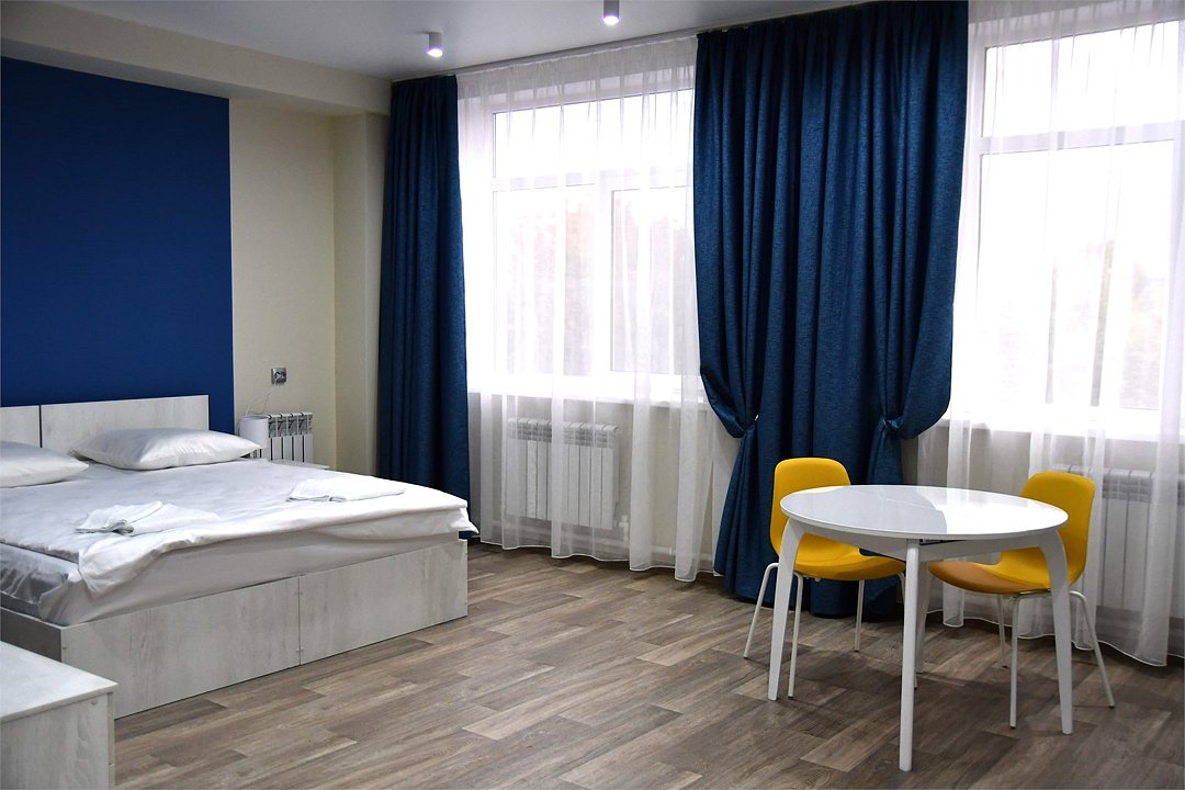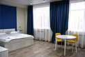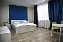 В двухместных номерах все расположено для уютного и удобного проживания. Интерьеры выдержаны в зелено-серых тонах, тонко гармонирующими со всей цветовой гаммой гостиницы. К услугам постояльцев имеется все необходимое: две кровати, которые могут быть объединены в одну общую двухспальную, две прикроватные тумбочки, холодильник, кондиционер, телевизор, с расположенный под ним TV столиком. Санузел располагает душем со стеклянными створками, унитазом, раковиной и зеркалом. В небольшой прихожей имеется вешалка и платяной шкаф. Две симпатичные табуретки тоже не будут лишними.Услуги и удобства