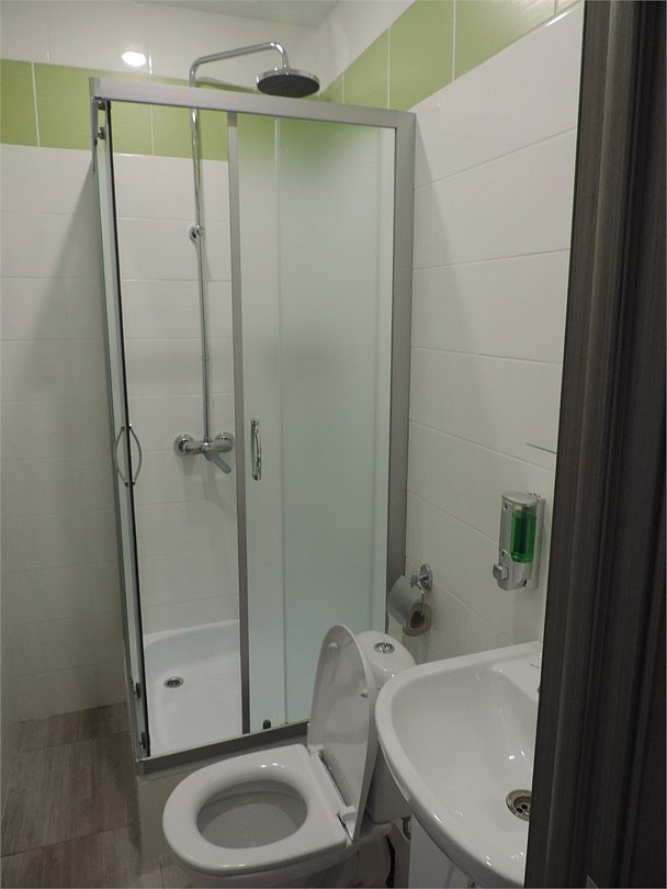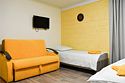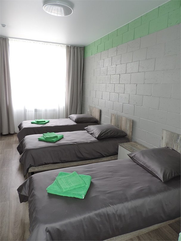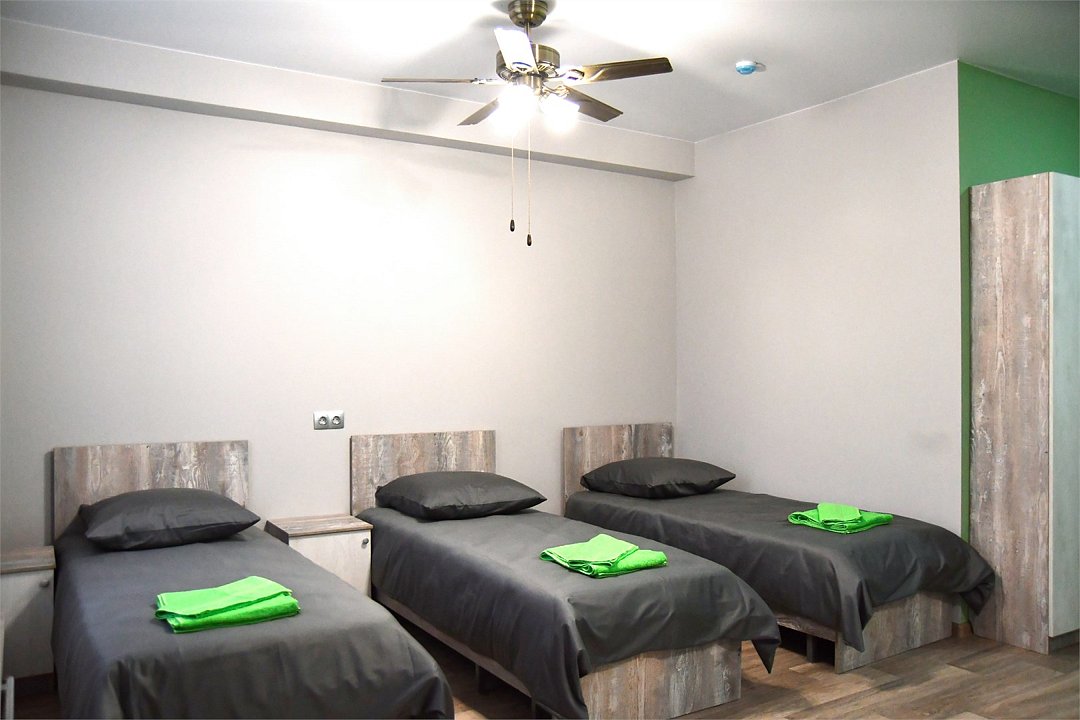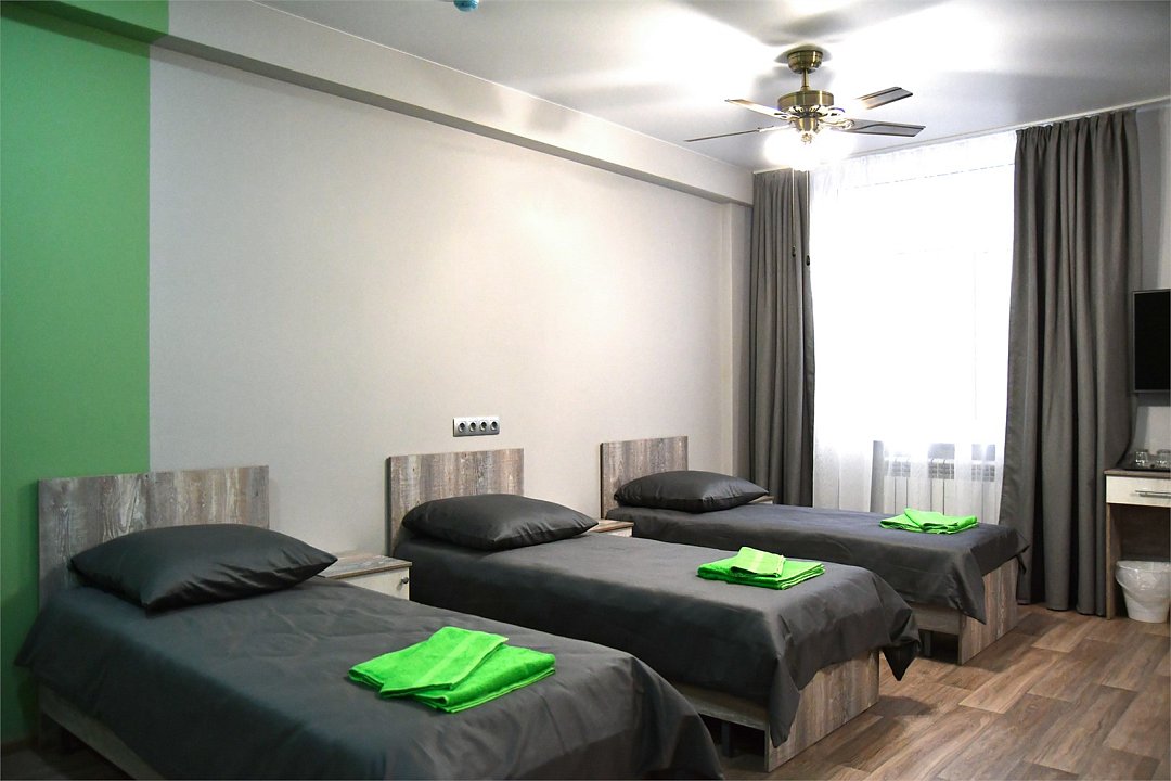 В трехместных номерах все расположено для уютного и удобного проживания. Интерьеры выдержаны в зелено-серых тонах, тонко гармонирующими со всей цветовой гаммой гостиницы. К услугам постояльцев имеется все необходимое: три кровати, три прикроватные тумбочки, холодильник, кондиционер, телевизор, с расположенный под ним TV столиком. Санузел располагает душем со стеклянными створками, унитазом, раковиной и зеркалом. В небольшой прихожей имеется вешалка и платяной шкаф. Две симпатичные табуретки тоже не будут лишними.Услуги и удобства