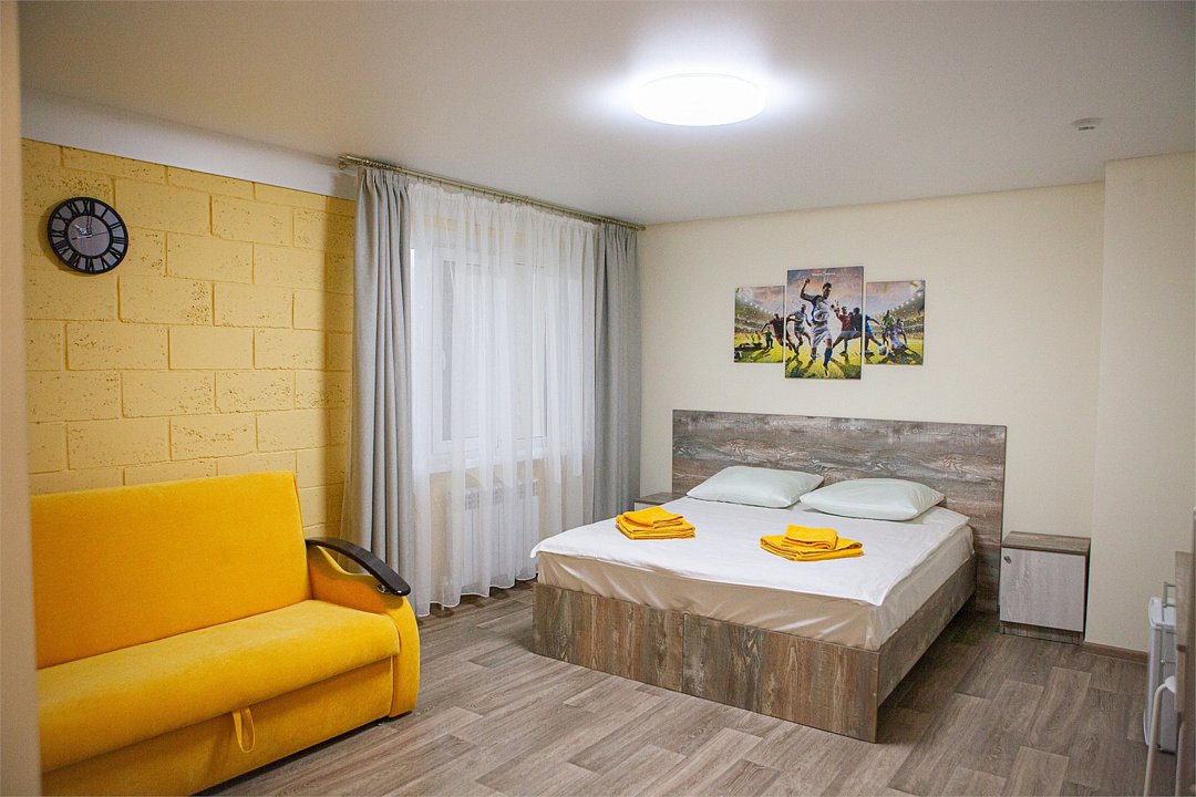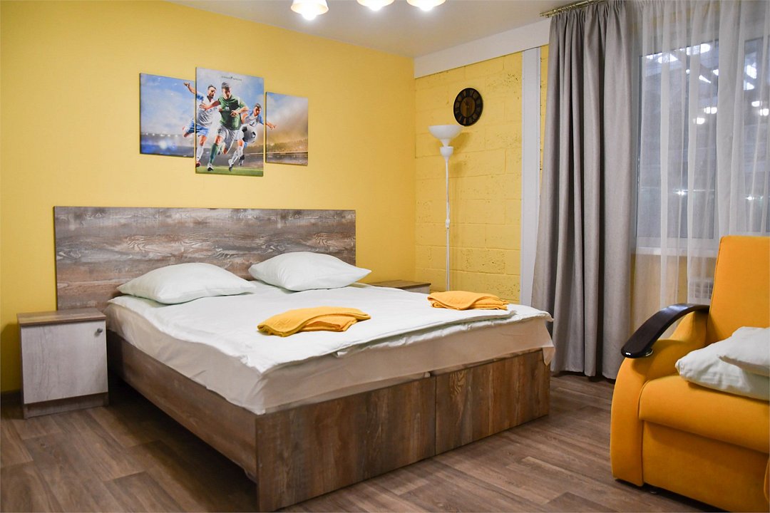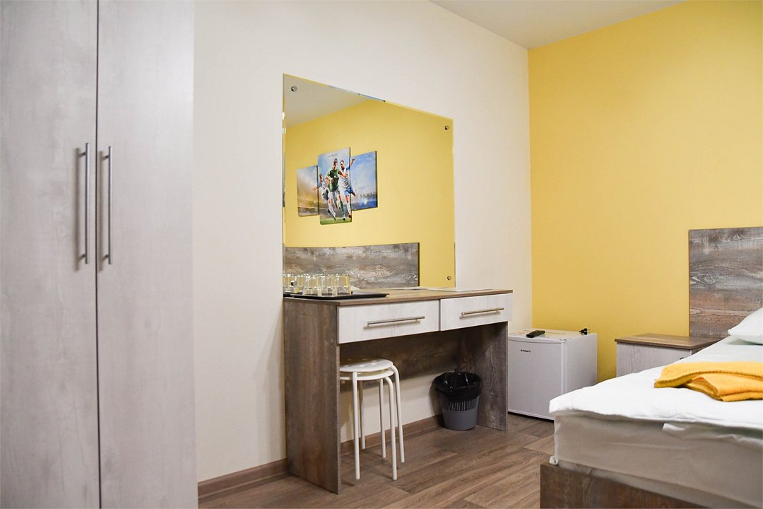 Семейный номер представляет собой уже помещение приближенное к настоящему домашнему уюту. В него входит помимо двухспальной кровати, ещё и большой мягкий диван, разложив который можно разместить на нем ещё двоих детей. К тому же имеется большая комната с ванной, располагающая всем необходимым для релаксации. И это ещё не все. Самое уникальное в этих номерах то, что окно выходит непосредственно на футбольную арену, где с высоты второго этажа можно следить за проходящими играми.Услуги и удобства