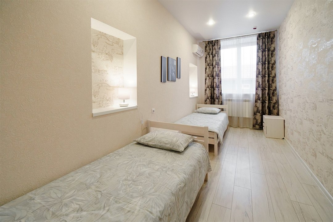 Wi-Fi, светильник, настольные лампы, фен, электронные замки, банные полотенца, гигиенические средства, две односпальные кровати, тумбы, зеркало, унитаз, раковина, отопление, душ, вид на город, кресло, вид во двор, ламинат, высокие потолки, туалетный столик, туалетный столик, сплит-система, цифровое тв, телевизор с плоским экраном, москитная сетка, номер для некурящих, пуфик, без питомцевВ номере