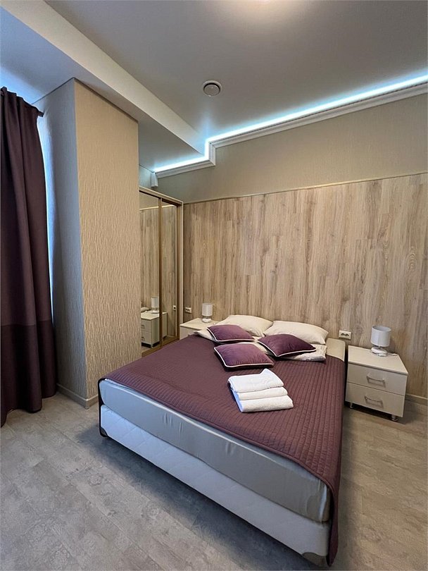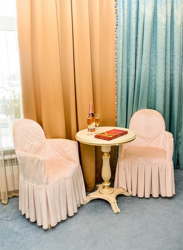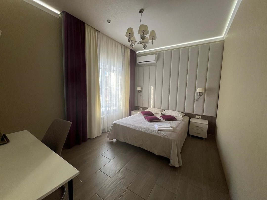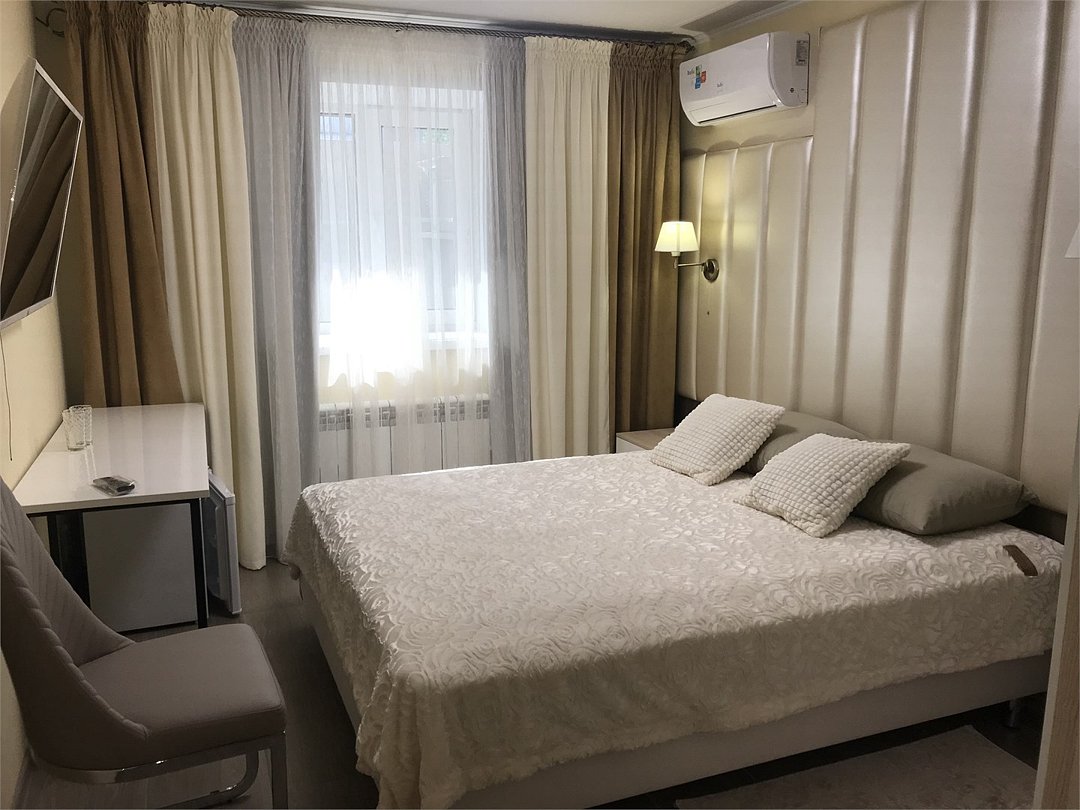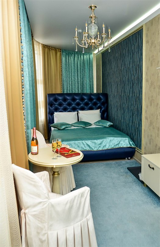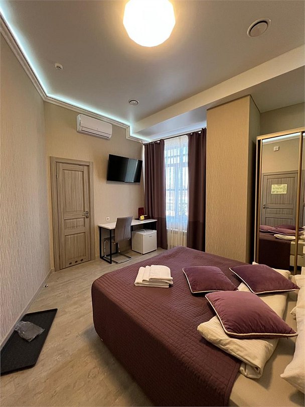 Оригинальный дизайн, большие окна с красивыми портьерами и удобная кровать с изголовьем придают номеру романтические нотки. Раздельный санузел с душем, большой телевизор, двойная дверь и зеркальный шкаф добавляют номеру изысканный шарм.Услуги и удобства