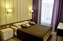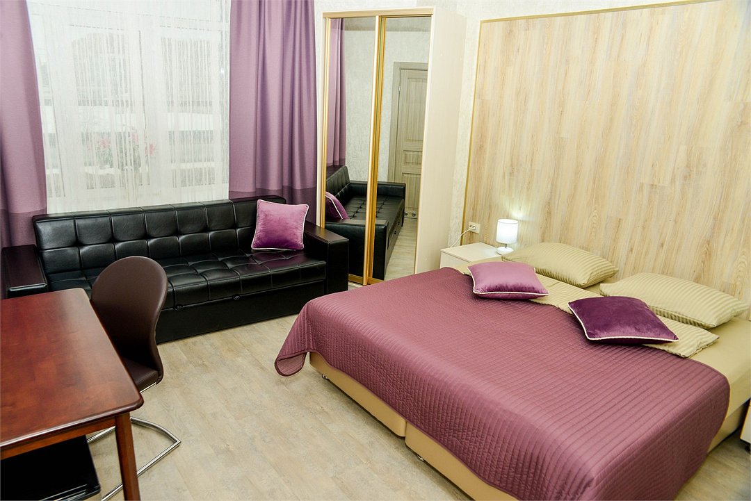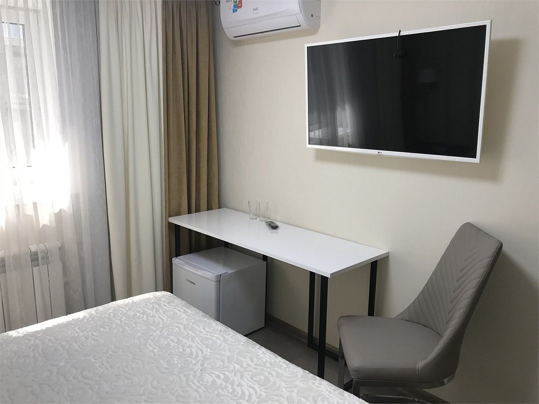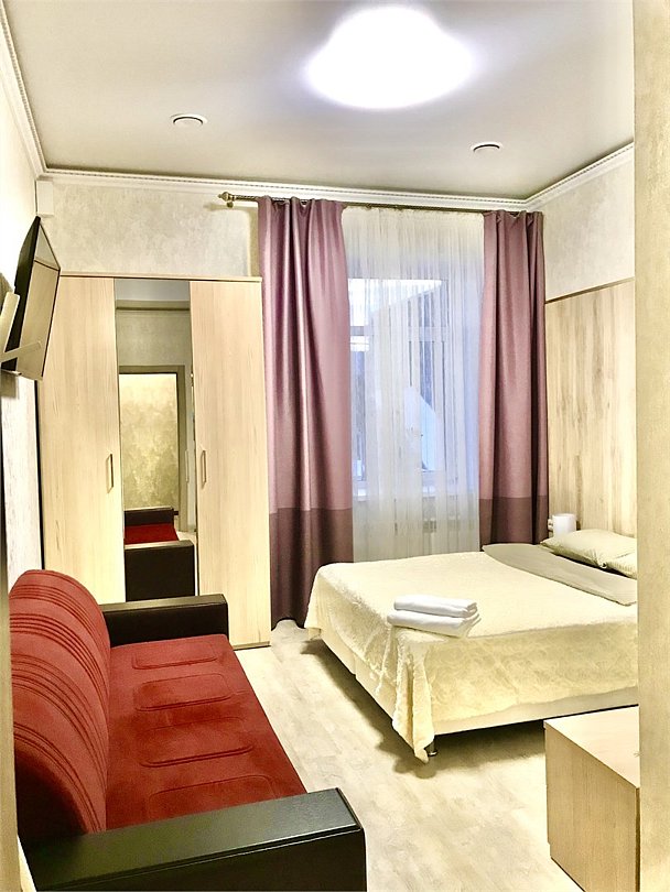 Стандартный номер с двуспальной кроватью и дополнительным спальным местом это либо односпальная кровать либо диван кровать. В номере большой телевизор, шкаф-купе , стол, стул, напольная вешалка для верхней одежды, сейф. Номер комплектуется на каждого гостя тремя полотенцами, зубной щеткой, пастой, мылом, шапочкой для душа, салфеткой для обуви.Услуги и удобства