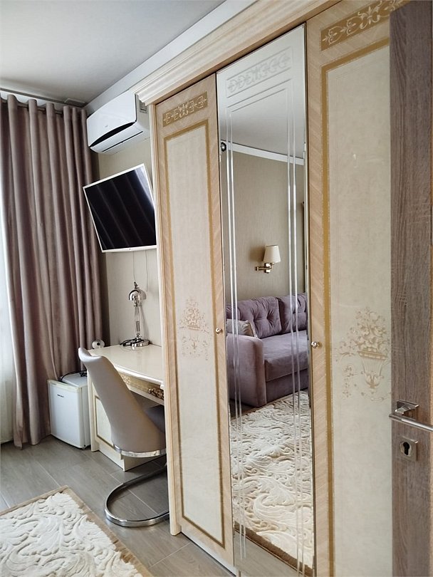Wi-Fi, кондиционер, фен, халаты, банные полотенца, тапочки, гигиенические средства, кровать «Queen size», шкаф для одежды, письменный стол, зеркало, пуфики, ковер, сейф, унитаз, раковина, отопление, душ, плиточное покрытие, стаканы, туалетные средства, цифровое тв, диван-кровать, раскладной диван, внутренний телефон, телевизор с плоским экраном, мини-холодильникВ гостиничном номере
