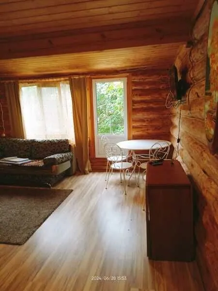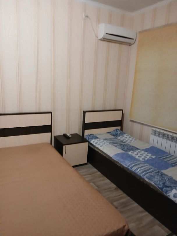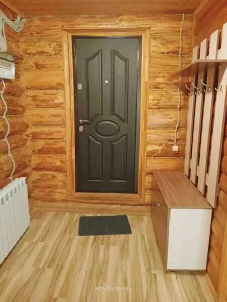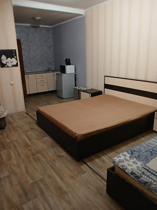 Домик шестиместный, деревянный. Внутри 2 комнаты с тремя кроватями, холодильник. Без удобств. К домику прилагается веранда, мангал.