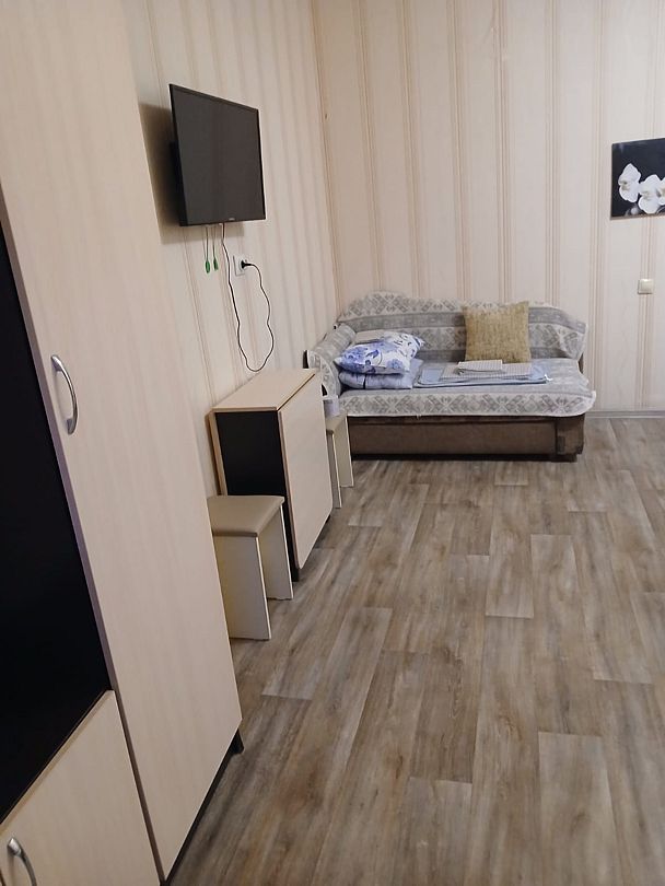 Трёхместный комфорт включает в себя: двуспальная кровать, диван одноместный, кондиционер, холодильник, свч, чайник, кухонная зона, обеденная зона, телевизор, санузел (душевая кабина).
