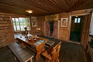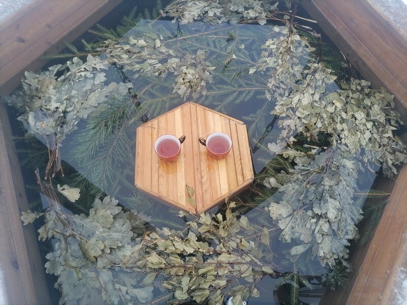 Бронировать заранее: растопка занимает 6 часов. В цену входит: растопленный банный дом, чайный стол из пяти сортов травяного чая, банный набор для каждого гостя: простынь, коврик для полка, шапка, тапки