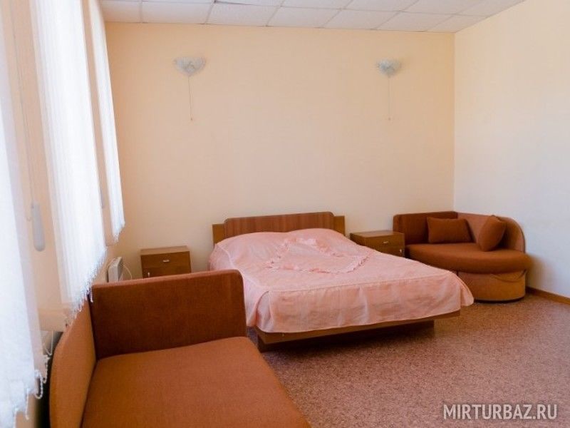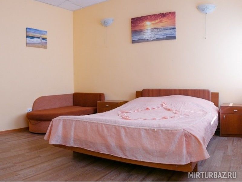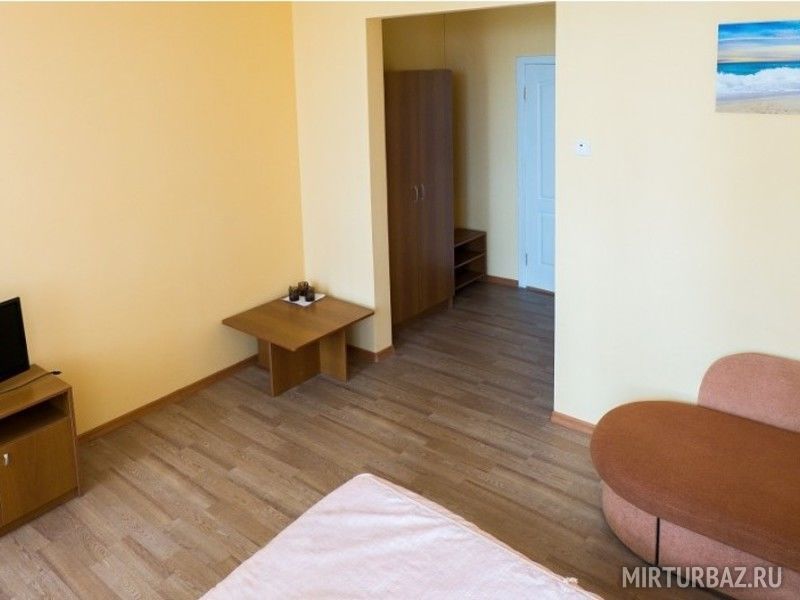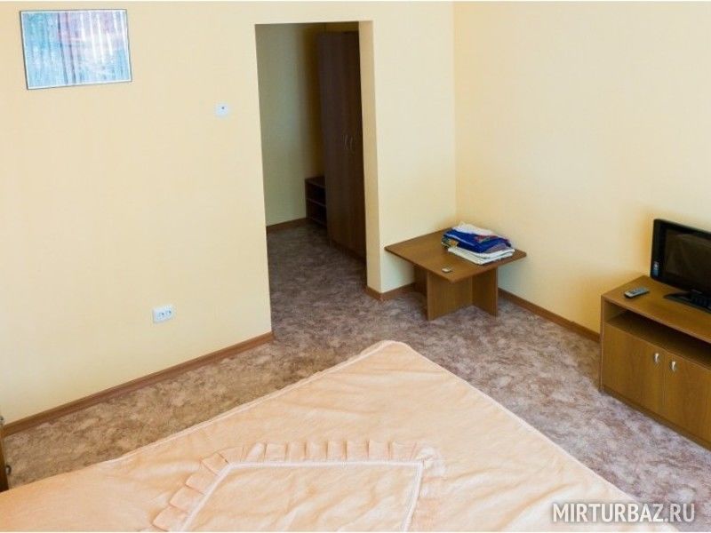 В номере: одна двуспальная кровать, 1 односпальный диван, телевизор, холодильник, журнальный стол, шкаф, 2 прикроватные тумбы, санузел, 3 комплекта постельного белья и полотенец.