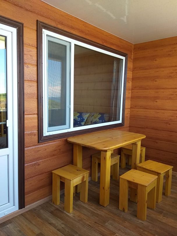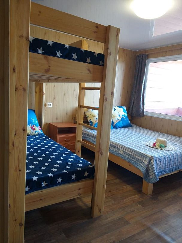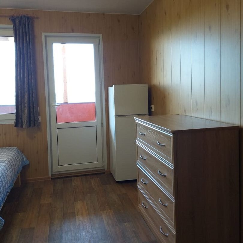 - одна двуспальная кровать, одна двухъярусная кровать, комод, тумбочка, холодильник, душевая кабинка, санузел, бойлер на 50 литров, раковина, стол, стулья.
