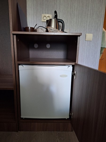 В зале для приема пищи можно уютно расположиться за столиком, посмотреть телевизор, приготовить чай или разогреть еду в микроволновке. Также доступен утренний кофе из кофемашины.
