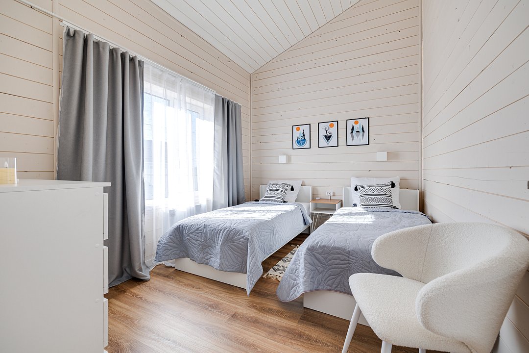 - Две уютные спальни — кровати с ортопедическими матрасами, постельное бельё и большой вместительный шкаф для вещей.