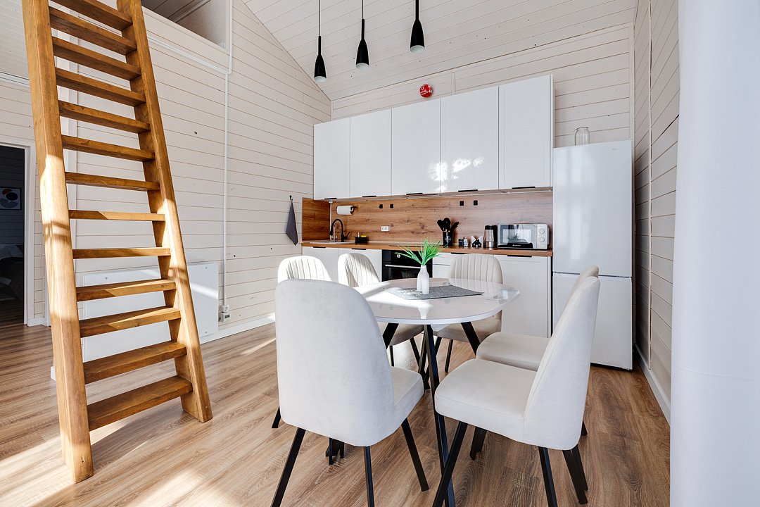 - Также спальное место на 2 гостей расположено на 2 ярусе над кухней-гостиной.