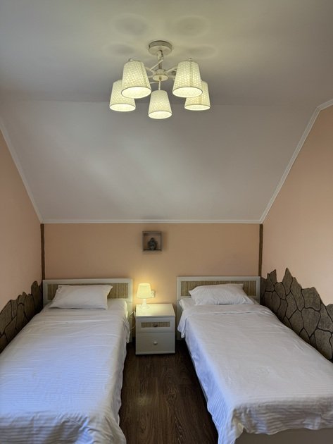 В коттедже два этажа. Первый этаж: кухня-столовая, спальня на четырех человек, санузел, сауна. Второй этаж: четыре спальни, санузел, балкон. Пять спален и двенадцать спальных мест (четыре двухспальные и четыре односпальные кровати + по запросу возможно еще два дополнительных места). Полностью укомплектованные спальные места на двенадцать человек.