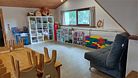 Детская игровая зона с игрушками, отдельно детский стол для 10 ребят, целая стена для рисования.