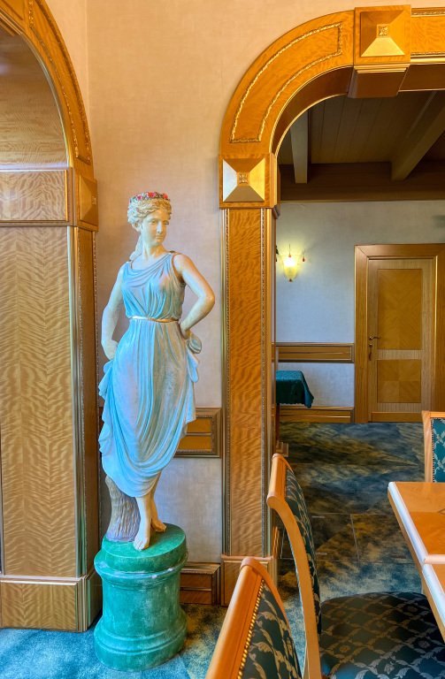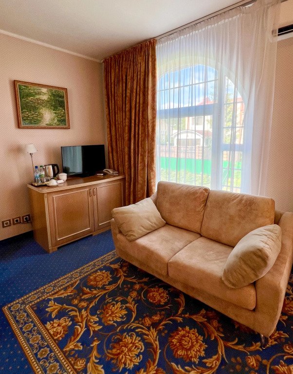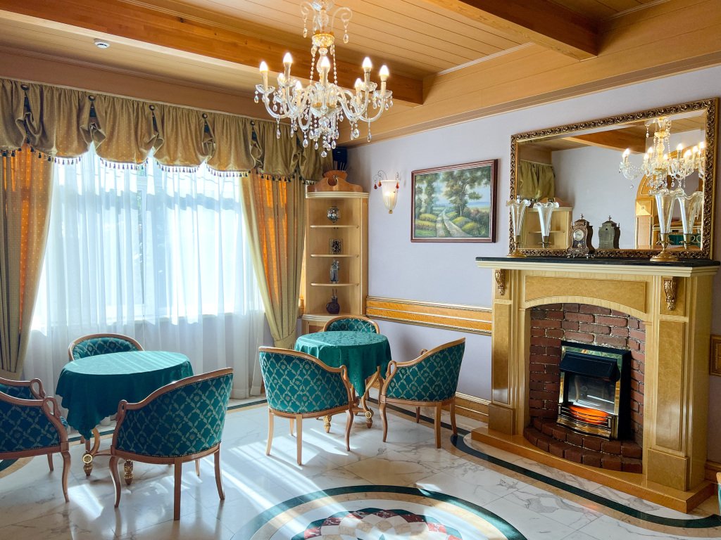 Отель состоит из нескольких корпусов. Каждый блок состоит из холла, кухни и шести номеров. На территории отеля расположена трапезная с блюдами русской кухни. При гостинице работает ресторан. Гостям доступны блюда европейской и итальянской кухни. Два зала ресторана, рассчитаны на 40 посадочных мест. Первый зал: с зимним садом, роялем и выходом на террасу, второй — мраморный зал с камином. Отель предлагает: кофе-брейки, фуршеты, банкеты, свадьбы, барбекю и корпоративные вечеринки.