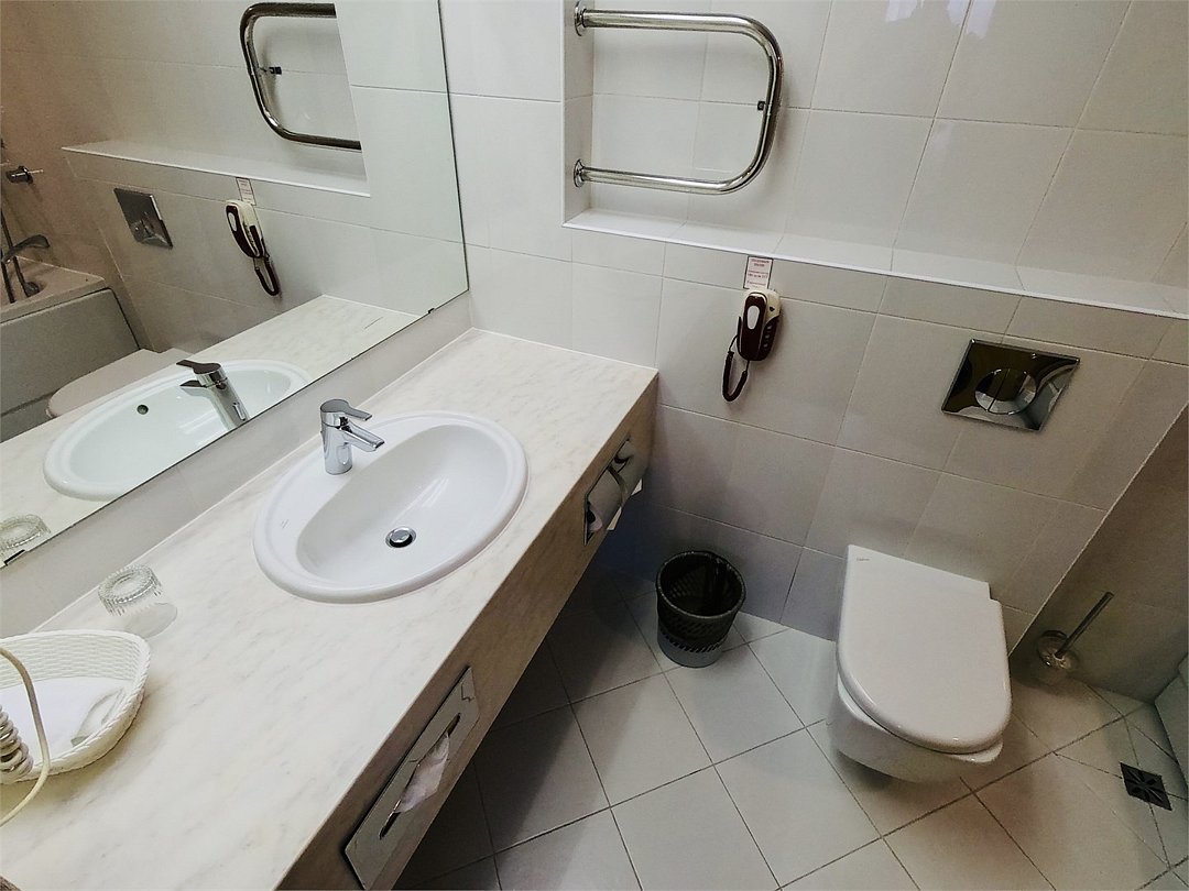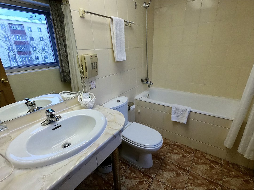 О номере: • просторный уютный однокомнатный номер площадью 27м2-30м2 с кроватью 1,60х2,05м; • электронный замок, индивидуальный электронный сейф; • комплект специальной, гостиничной мебели производства Италии; • спутниковое телевидение, телефон, выход в Интернет; • тепло-вентиляционная система, кондиционирование; • холодильник, электрический чайник, набор посуды; • мини-кухня с микроволновой печью (в отдельных номерах); • ванная комната с феном, телефоном, набором полотенец, халатом-кимоно, тапочками и набором туалетных принадлежностей; • принадлежности для чистки одежды и обувиУслуги и удобства