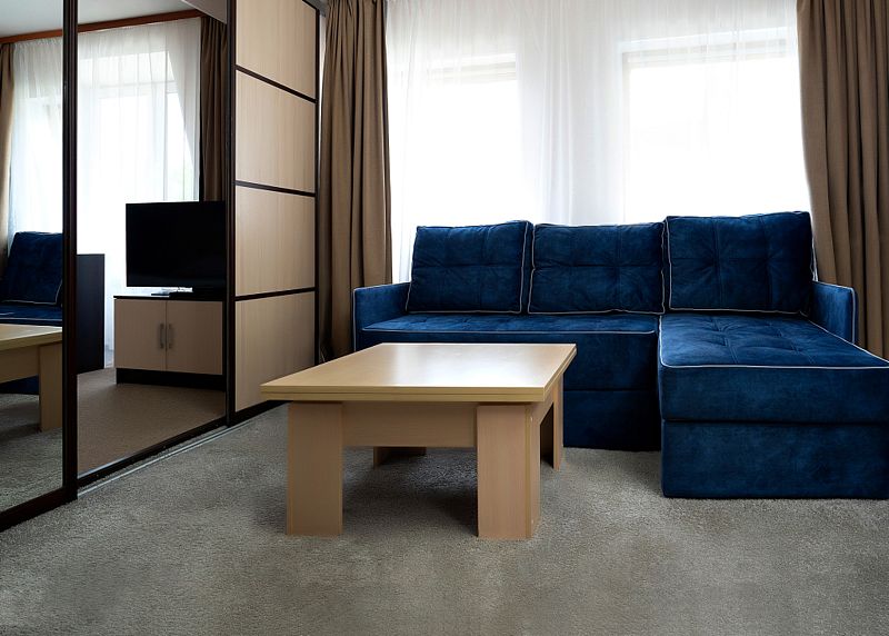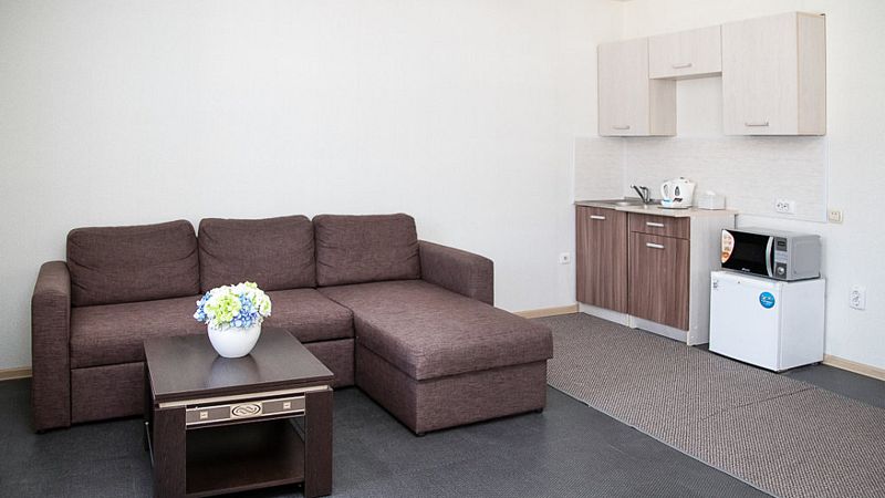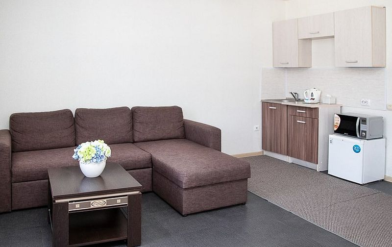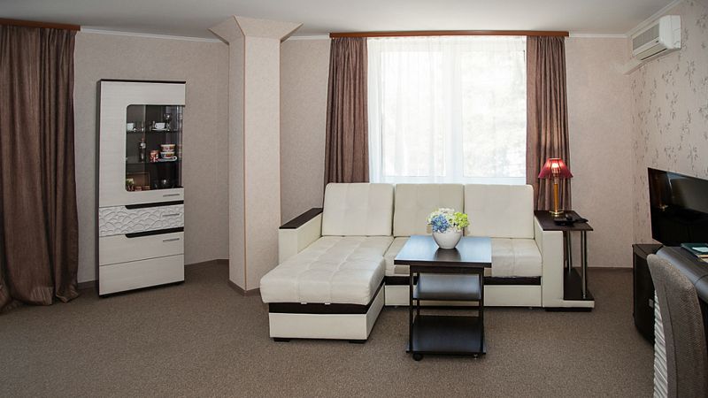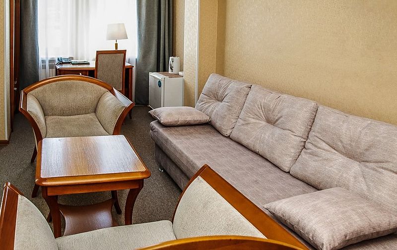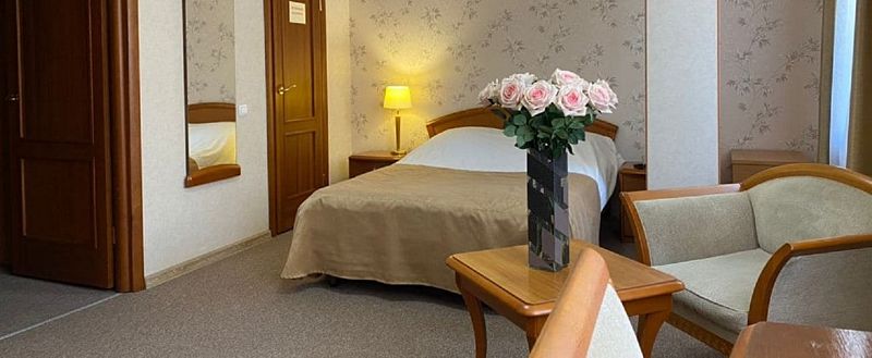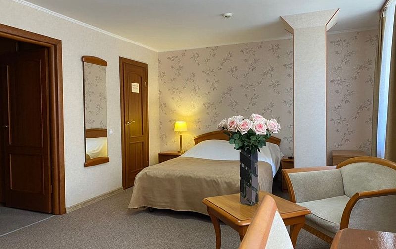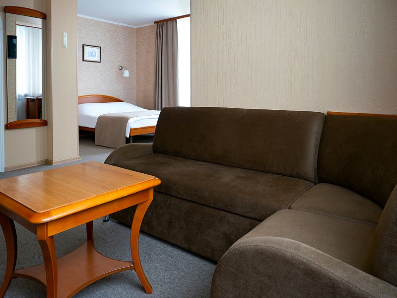 Уютный номер со спальней и гостиной, подойдет для длительной деловой поездки или отдыха. В номере кровать 160*200, диван трансформирующийся в спальное место, мягкая мебель, письменный стол, телевизор, микроволновая печь, маленький холодильник, чайник, столовые приборы и посуда, бутилированная вода, индивидуальный сейф. Дизайн, детали интерьера и некоторые характеристики каждого номера отличаются. Есть номер с выходом на террасу и лоджией. Номер с обеденной зоной, номер с гардеробной. В ванной комнате – душевая кабина, расширенный набор косметических принадлежностей, фен, халаты, тапочки. Стоимость номера указана на размещение одного или двух человек на основном спальном месте (кровати). Если Вы планируете использовать дополнительное спальное место (диван), добавьте данную услугу на этапе бронирования. Если Вы указали размещение троих человек, то тариф учитывает стоимость дополнительного места автоматически. Бесплатный Wi-Fi, гладильные принадлежности на этаже. Пожалуйста, обратите внимание, что при бронировании подтверждается категория номера и стоимость размещения. Выполнение особых пожеланий, таких как этаж и крыло расположения номера, ширина кроватей, вид из окна и другие характеристики, не гарантируется, особые пожелания учитываются по возможности, Вы можете выбрать их или указать в комментариях. На этапе бронирования можно ознакомиться со всеми доступными тарифами на выбранные даты и включить дополнительные услуги. Возможно размещение с питомцами за дополнительную плату. Стоимость зависит от размера животного. Для питомцев необходимо иметь с собой посуду и полотенца, для кошек – туалет. В случае размещения с питомцами, полную ответственность за животное перед гостиницей и другими гостями, несет владелец животного. Пожалуйста, не забудьте ознакомится с правилами отмены бронирований. Если у Вас остались вопросы, свяжитесь с нами по указанным контактам.Услуги и удобства