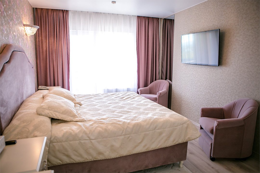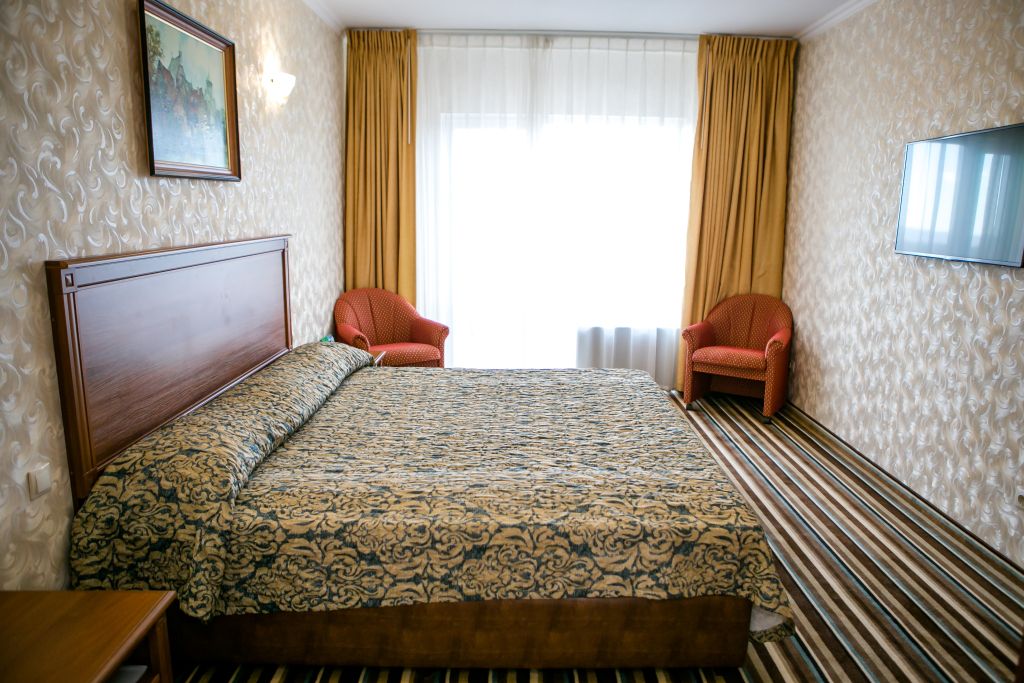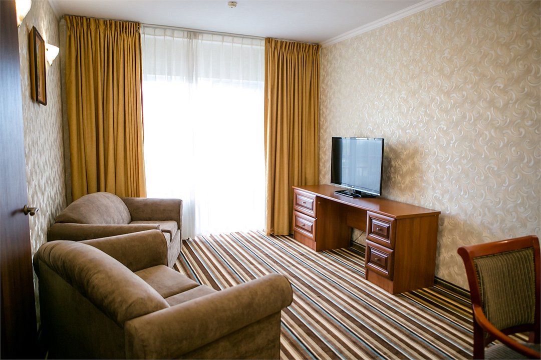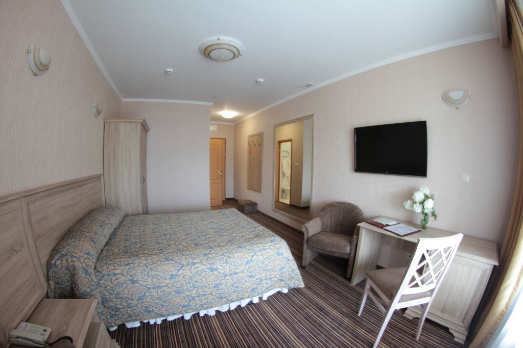 кабельное телевидение, Wi-Fi, светильник, фен, электронные замки, обогреватель, ванная комната, ванна, санузел, халаты, банные полотенца, тапочки, косметические средства, балкон, двуспальная кровать, кресла, шкаф для одежды, вешалки, журнальный столик, письменный стол, багажная тумба, зеркало, чайный набор, сейф, унитаз, раковина, кулер на этаже, кресло, стул, туалетные средства, раскладной диван, внутренний телефон, телевизор с плоским экраном, мини-холодильник, номер для некурящих, фанкойл, фитнес-зона, кресло-кровать, чайная станция, уборка номера, услуги прачечной (платно), вешалки-плечики, бутилированная водаВ гостиничном номере