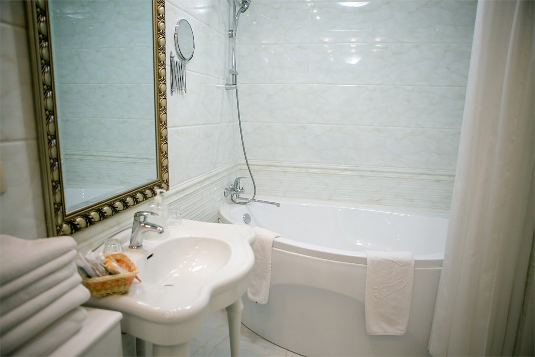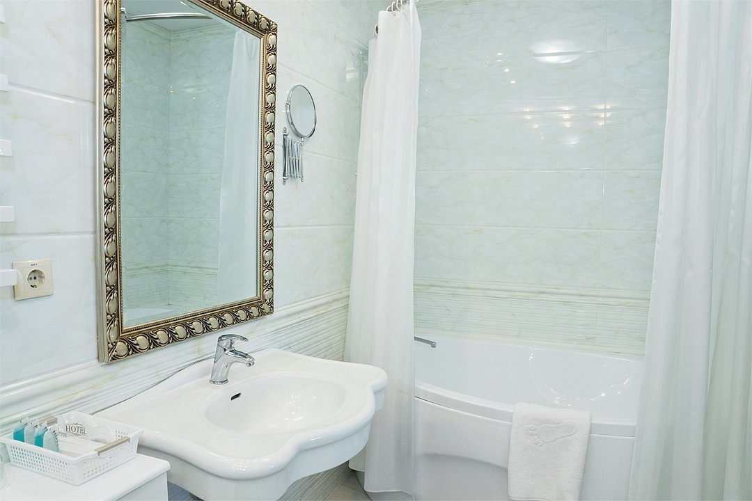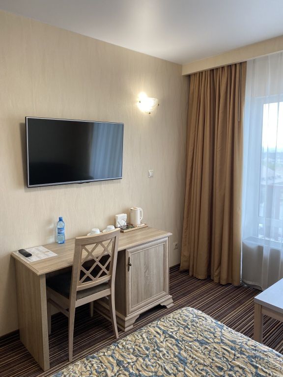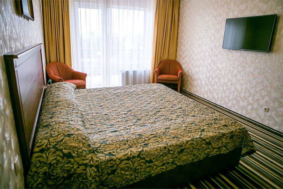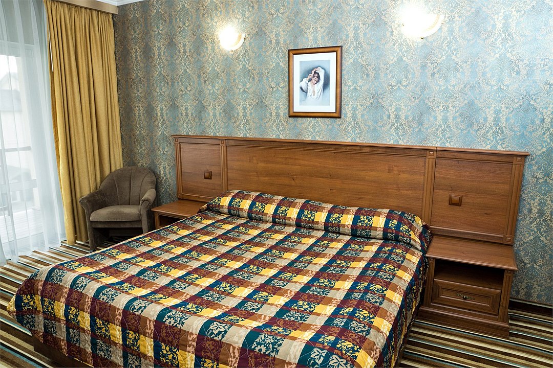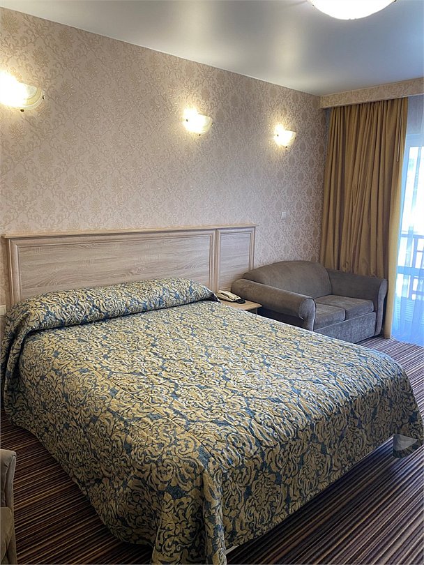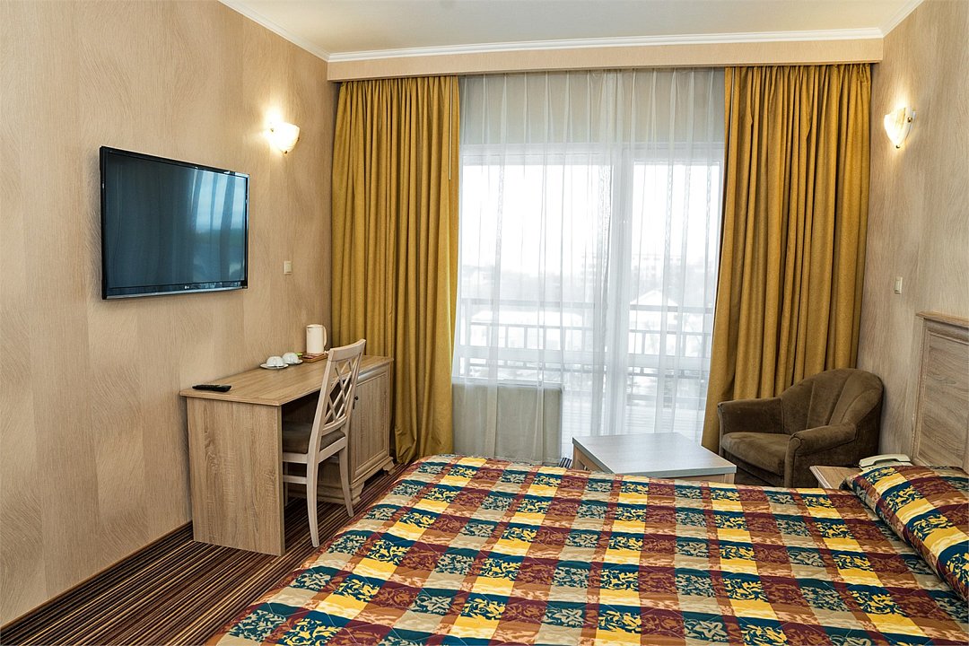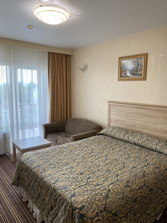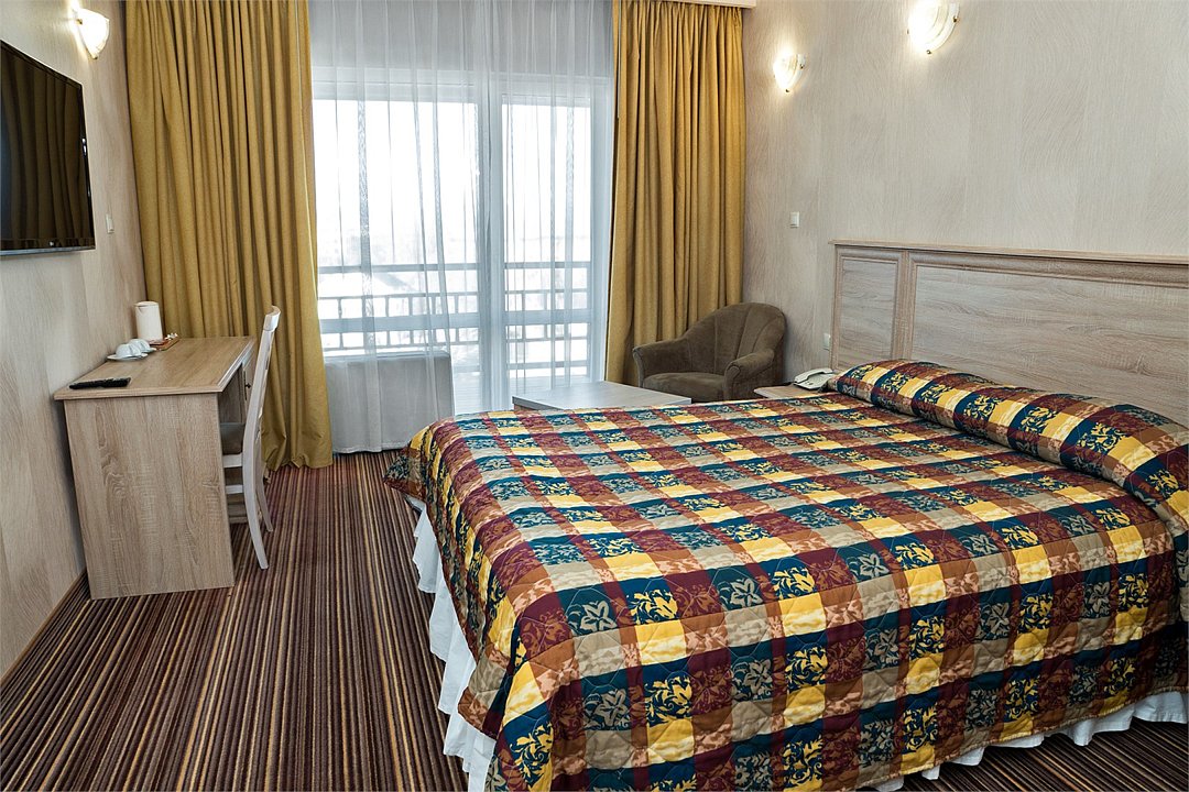 В номере двухспальная кровать 160*200 и раскладной диван 110*180, что удобно для проживания семьи с детьми. В номере балкон. Собственная ванная комната с ванной, разовыми принадлежностями, халатами и тапочками. Чайная станция и мини холодильник.Услуги и удобства