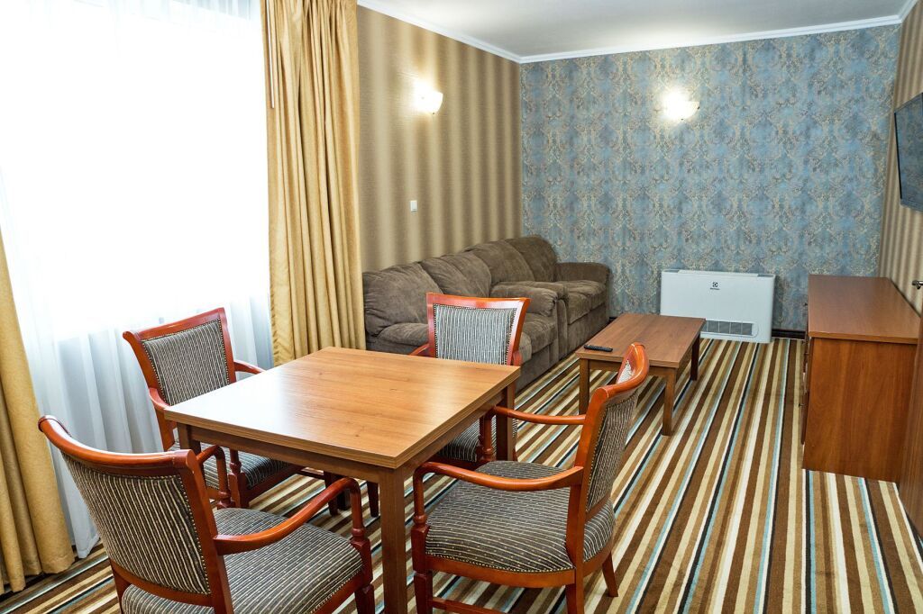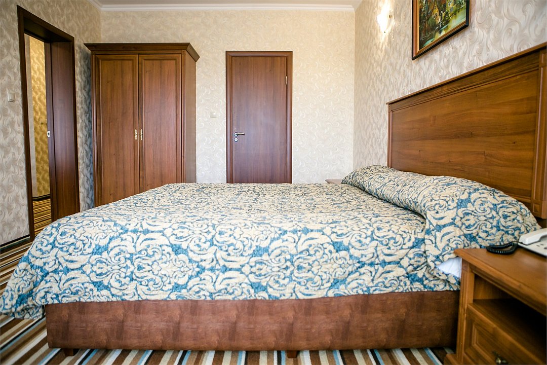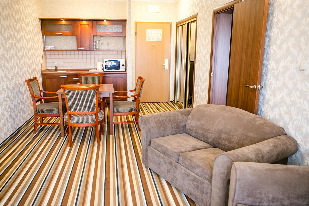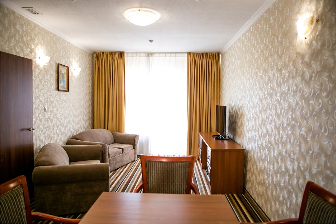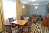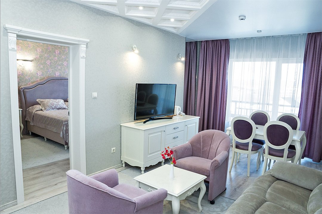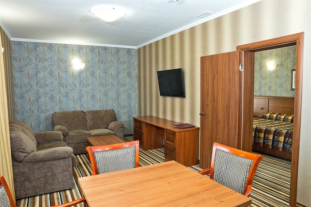 Просторный двухкомнатный светлый номер, состоящий из прихожей, ванной комнаты, гостиной с большим обеденным столом и спальни с 1 широкой кроватью. Современный дизайн дополняется удобной мебелью, в номере оборудована зона отдыха с дополнительным диваном, в каждой комнате ЖК телевизор со спутниковым ТВ. Номер подходит как для романтических встреч, так и для отдыха всей семьёй.Услуги и удобства