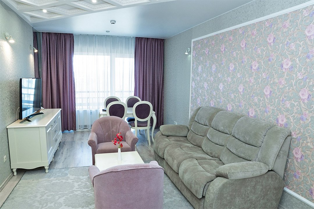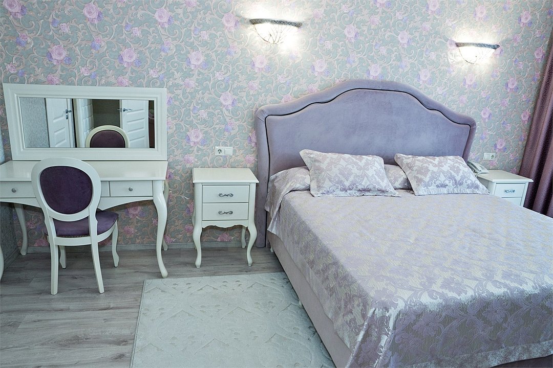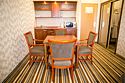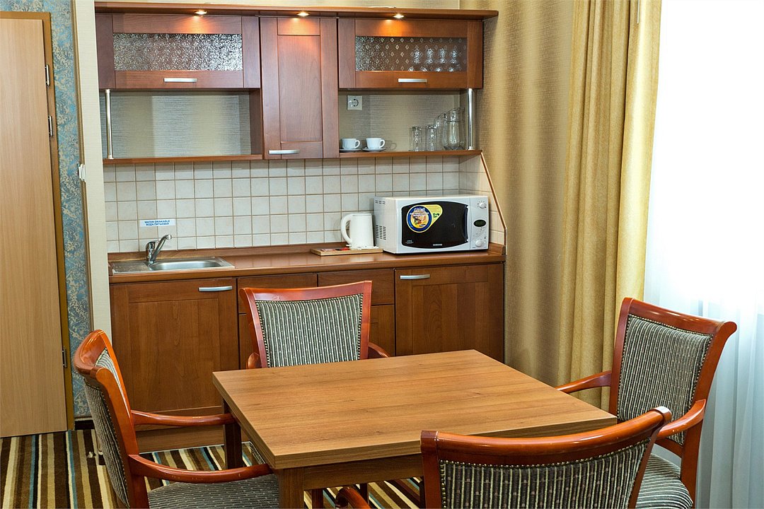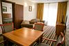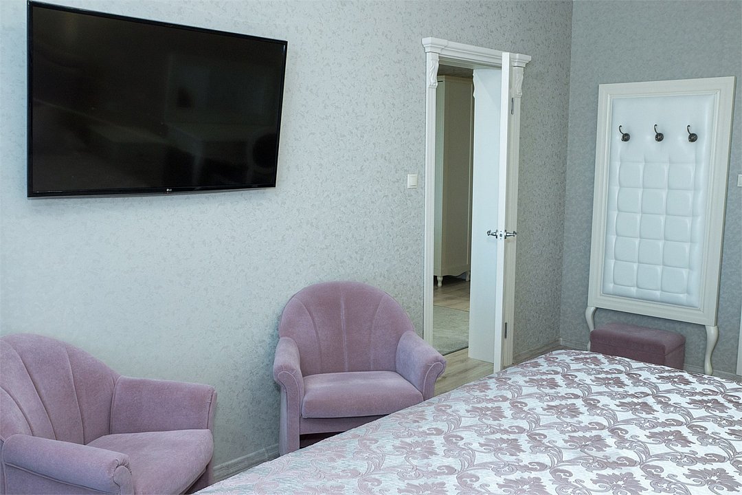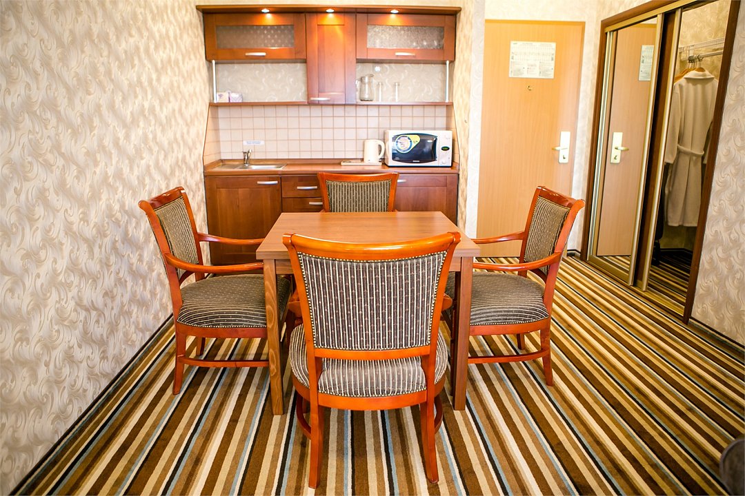 Просторный двухкомнатный светлый номер, состоящий из прихожей, ванной комнаты, гостиной с большим обеденным столом и спальни с 1 широкой кроватью. Современный дизайн дополняется удобной мебелью, в номере оборудована зона отдыха с дополнительным диваном, в каждой комнате ЖК телевизор со спутниковым ТВ. Номер подходит как для романтических встреч, так и для отдыха всей семьёй.Услуги и удобства