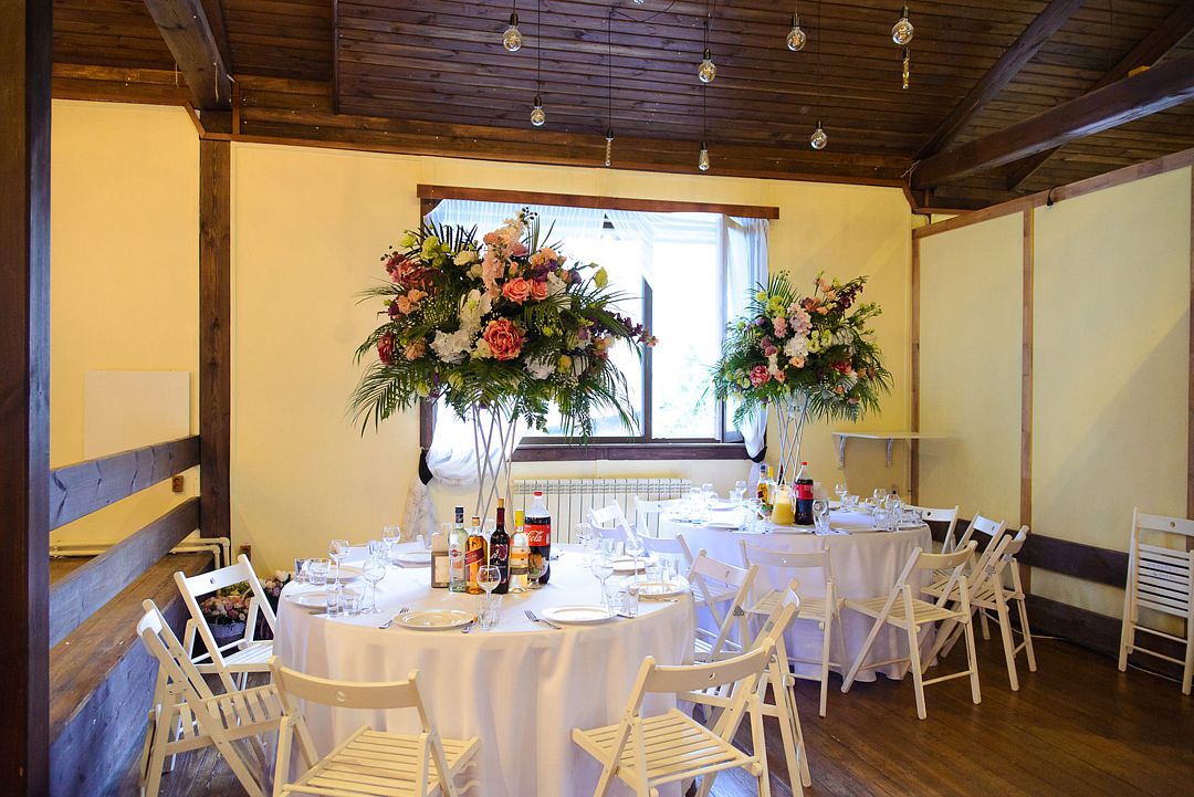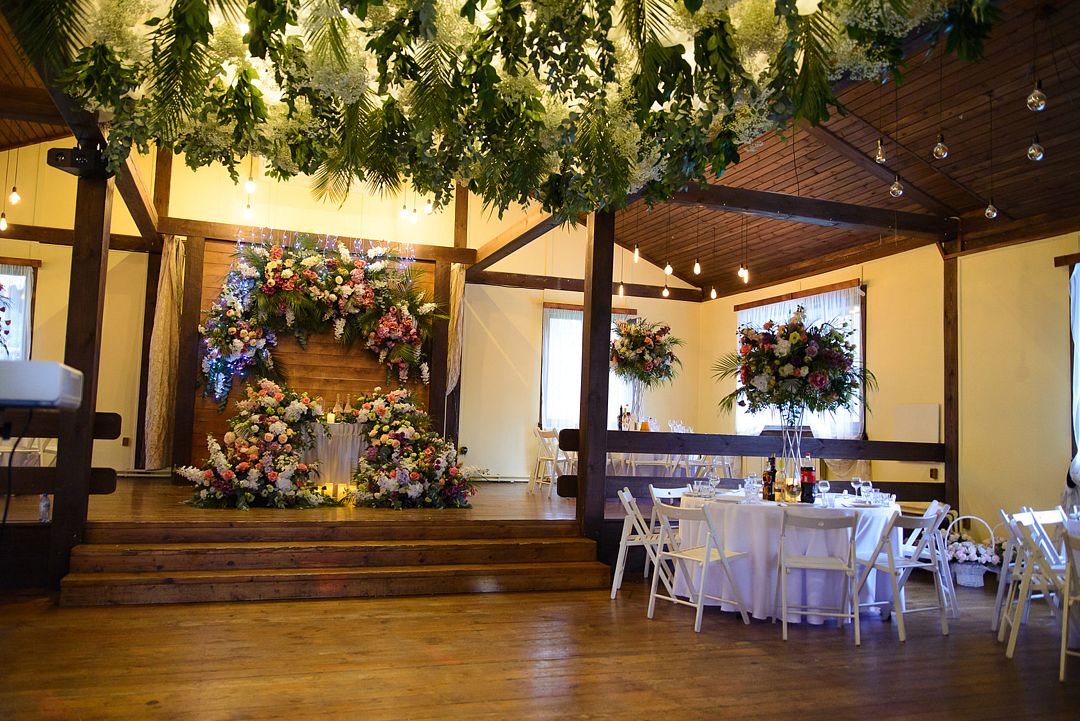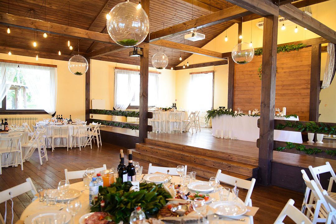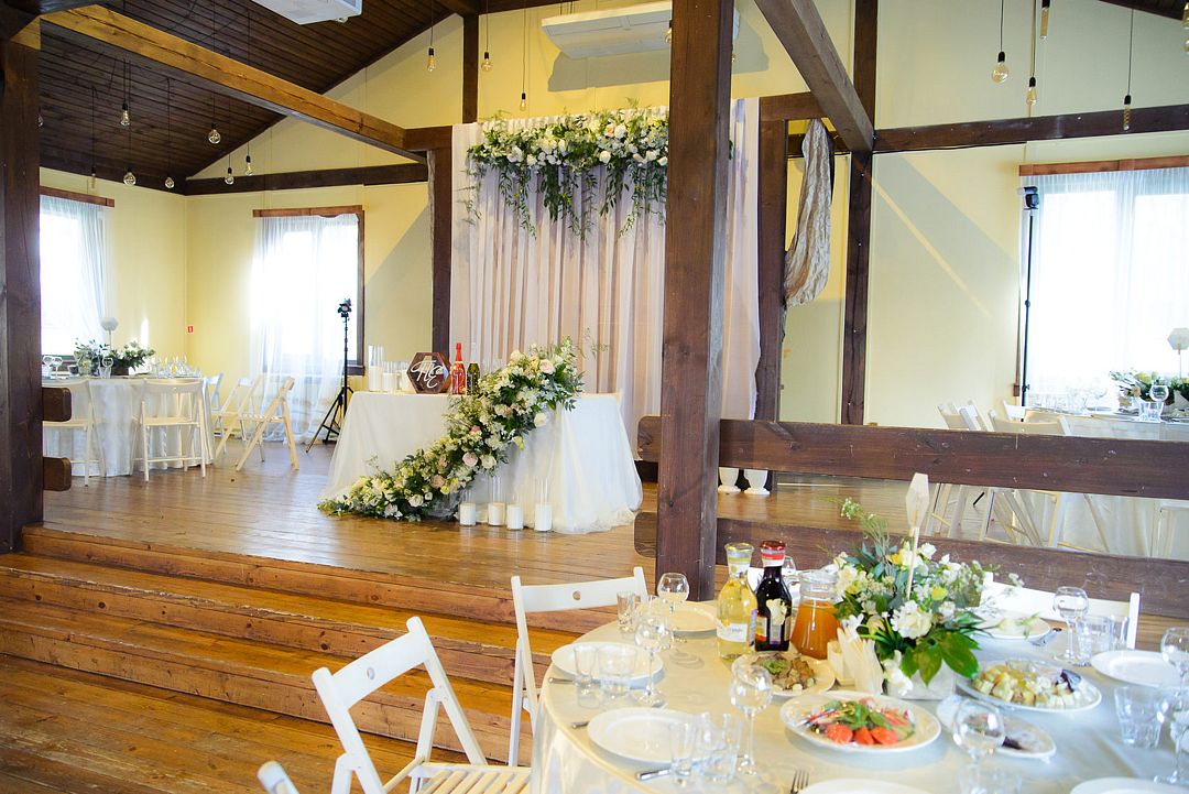 Просторный зал с высоким потолком. Отделка из натуральных материалов создает очень теплое настроение и одновременно позволяет декорировать пространство согласно общей идее свадьбы в любом цветовом оформлении.