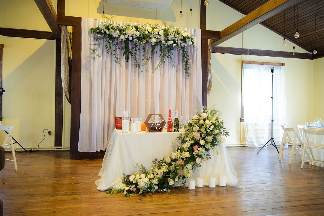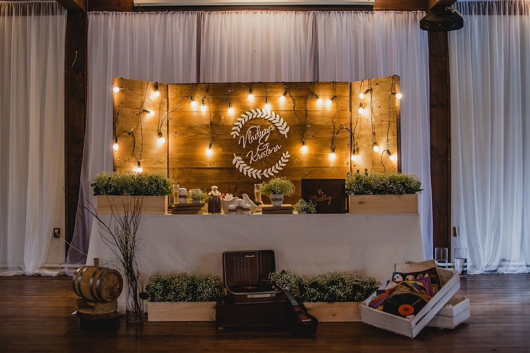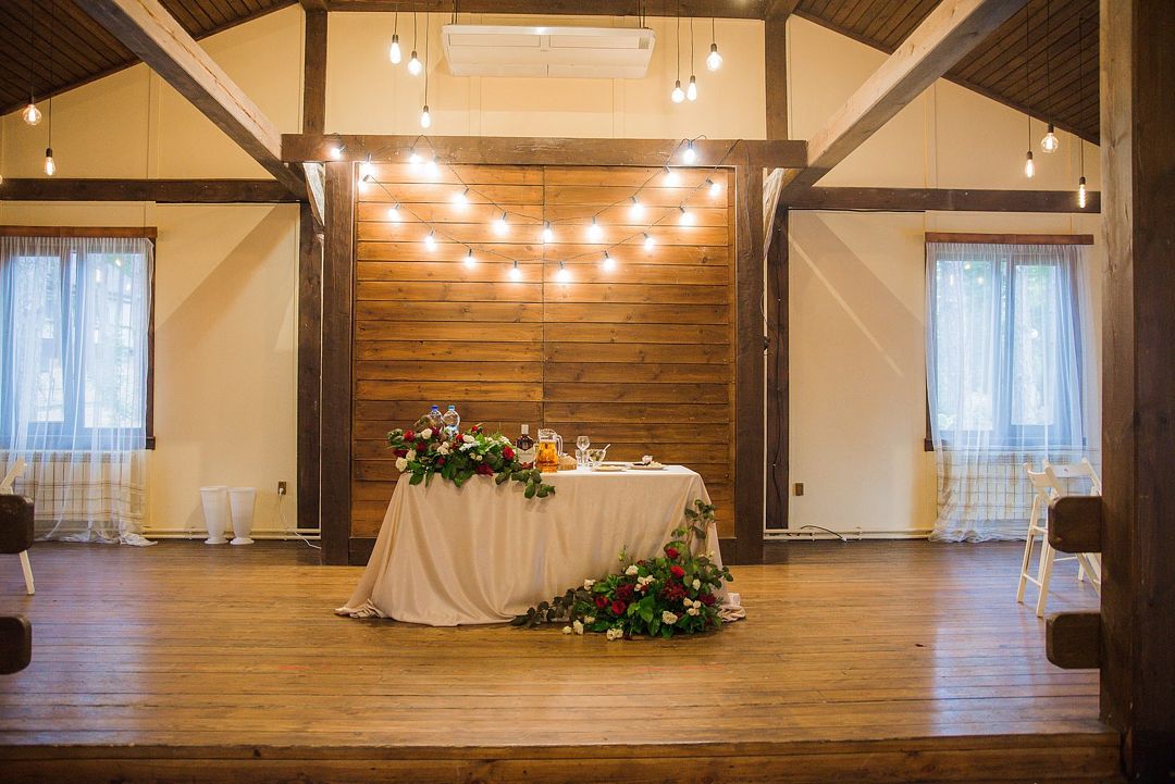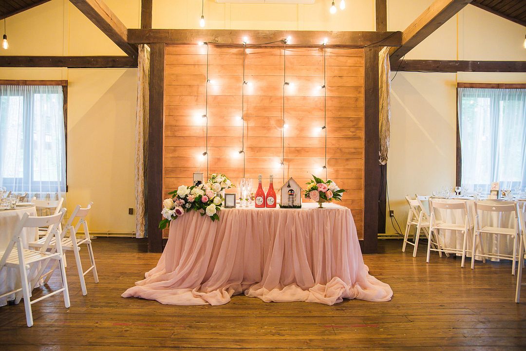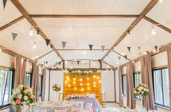Просторный зал с высоким потолком. Отделка из натуральных материалов создает очень теплое настроение и одновременно позволяет декорировать пространство согласно общей идее свадьбы в любом цветовом оформлении.