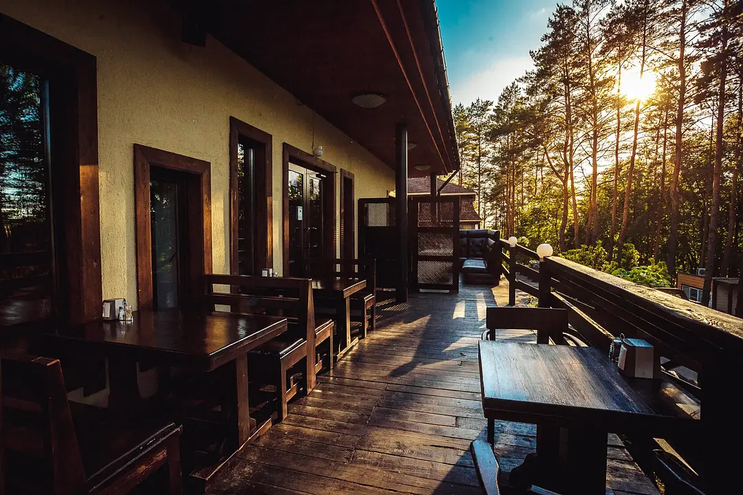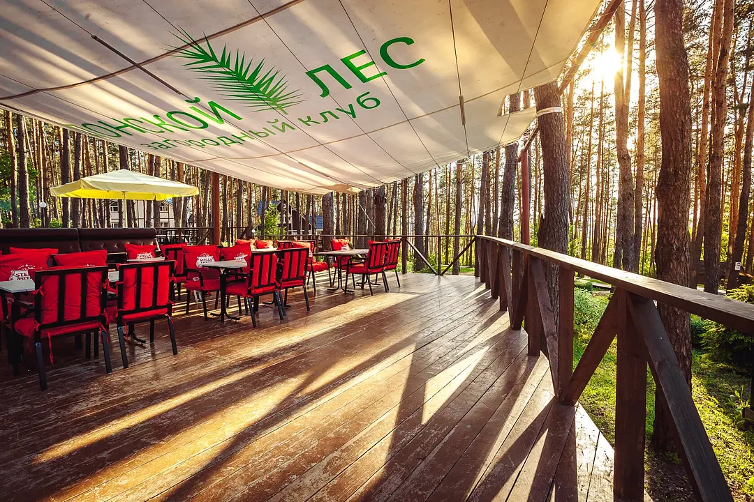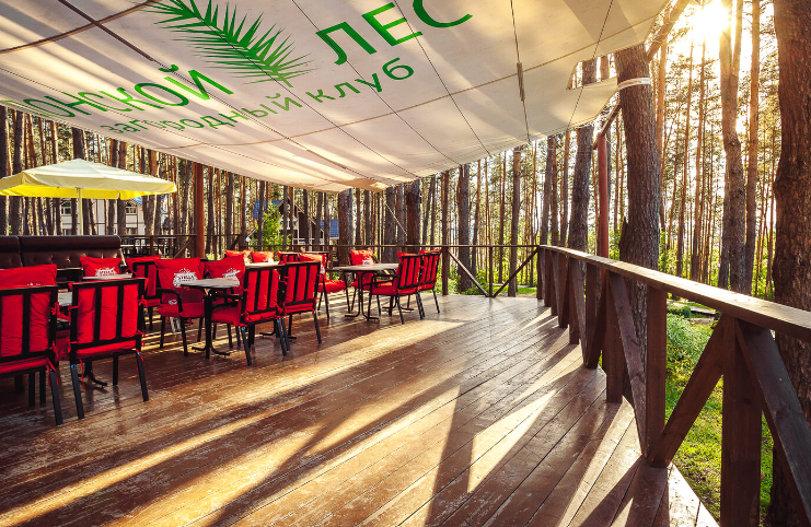Открытая площадка на просторной летней веранде под навесом с видом на лес.