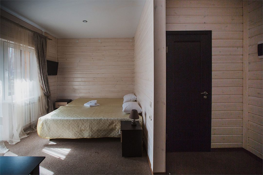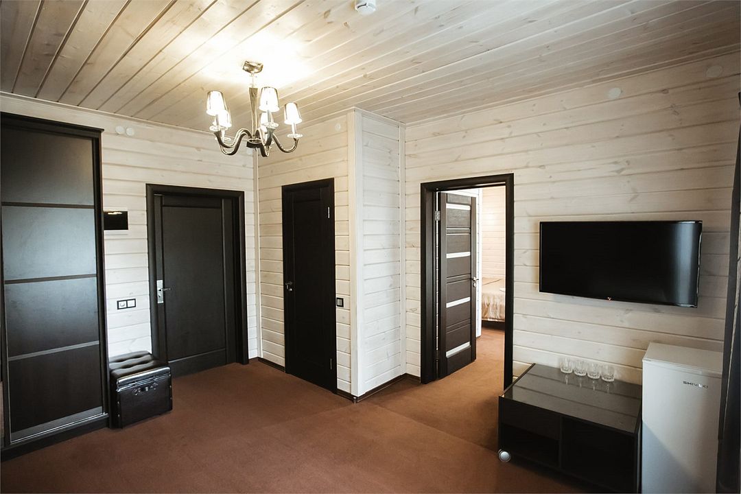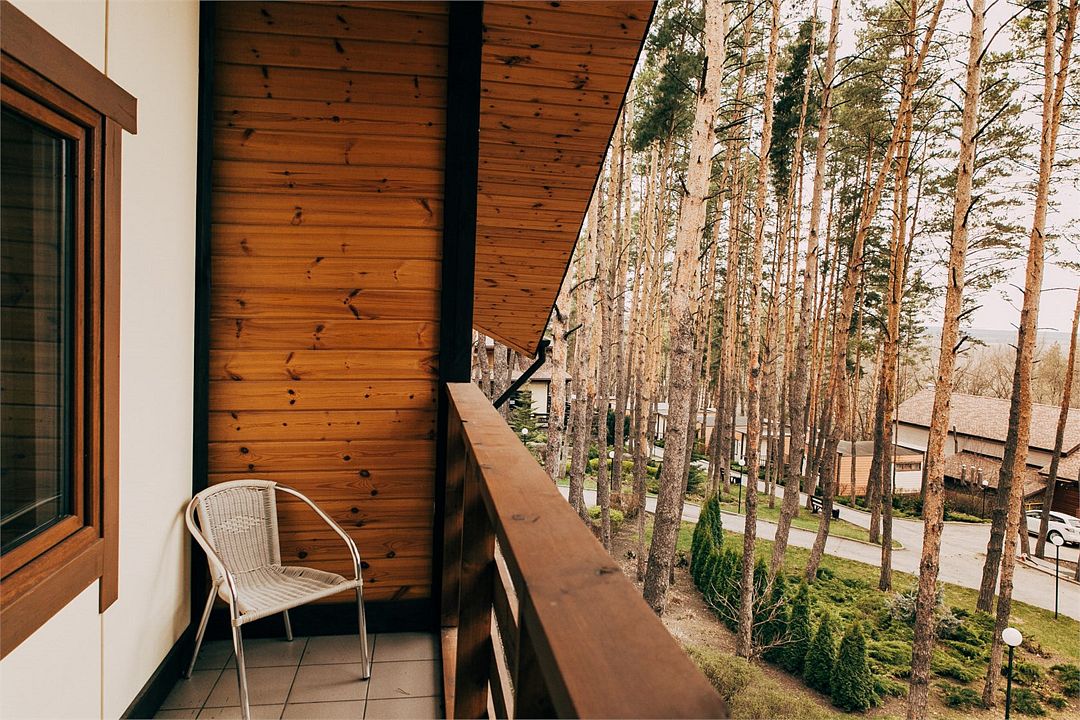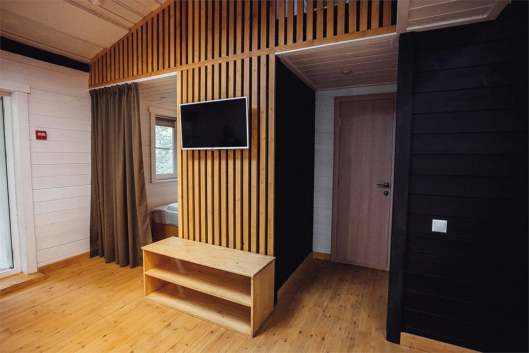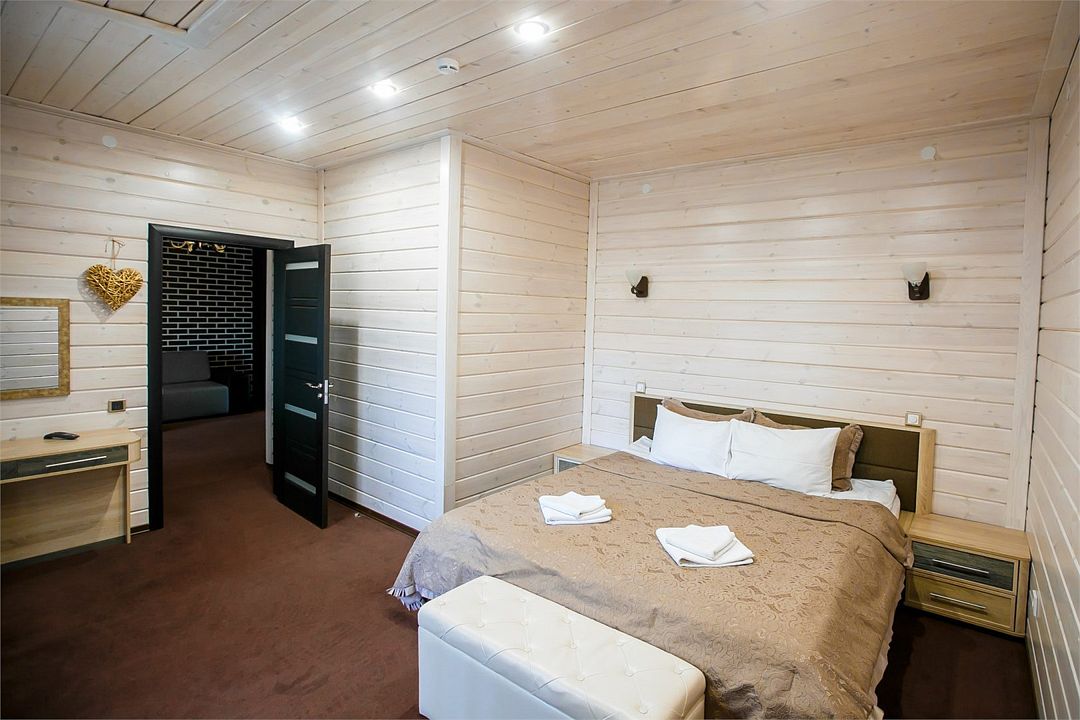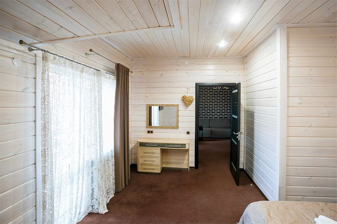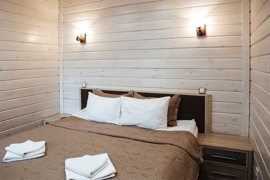 Отлично подойдёт для отдыха большой семьи и компании друзей. Также это хороший вариант для тех, кто ценит не только комфорт, но и эстетику. Номера, отделанные натуральным деревом, погружают гостя в атмосферу спокойствия и комфорта, а выход на общую веранду позволяет насладиться сосновым бором в полной мере.