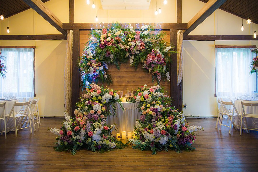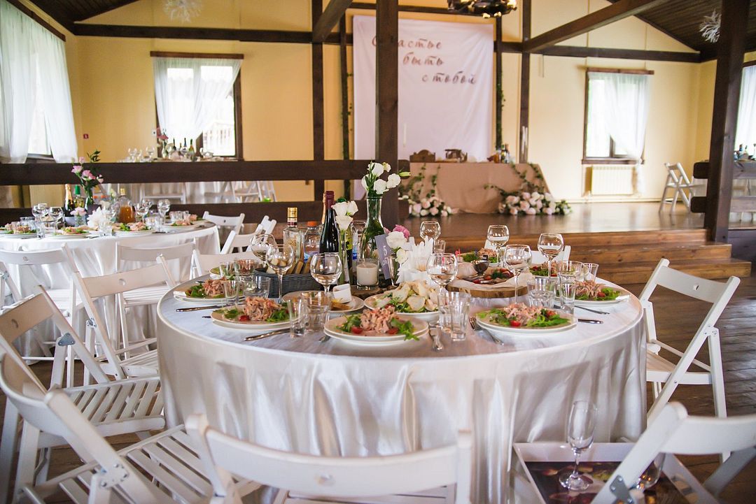 Круглые столы с удобными стульями гармонично заполняют пространство, а зона виновников торжества находится в центре внимания.