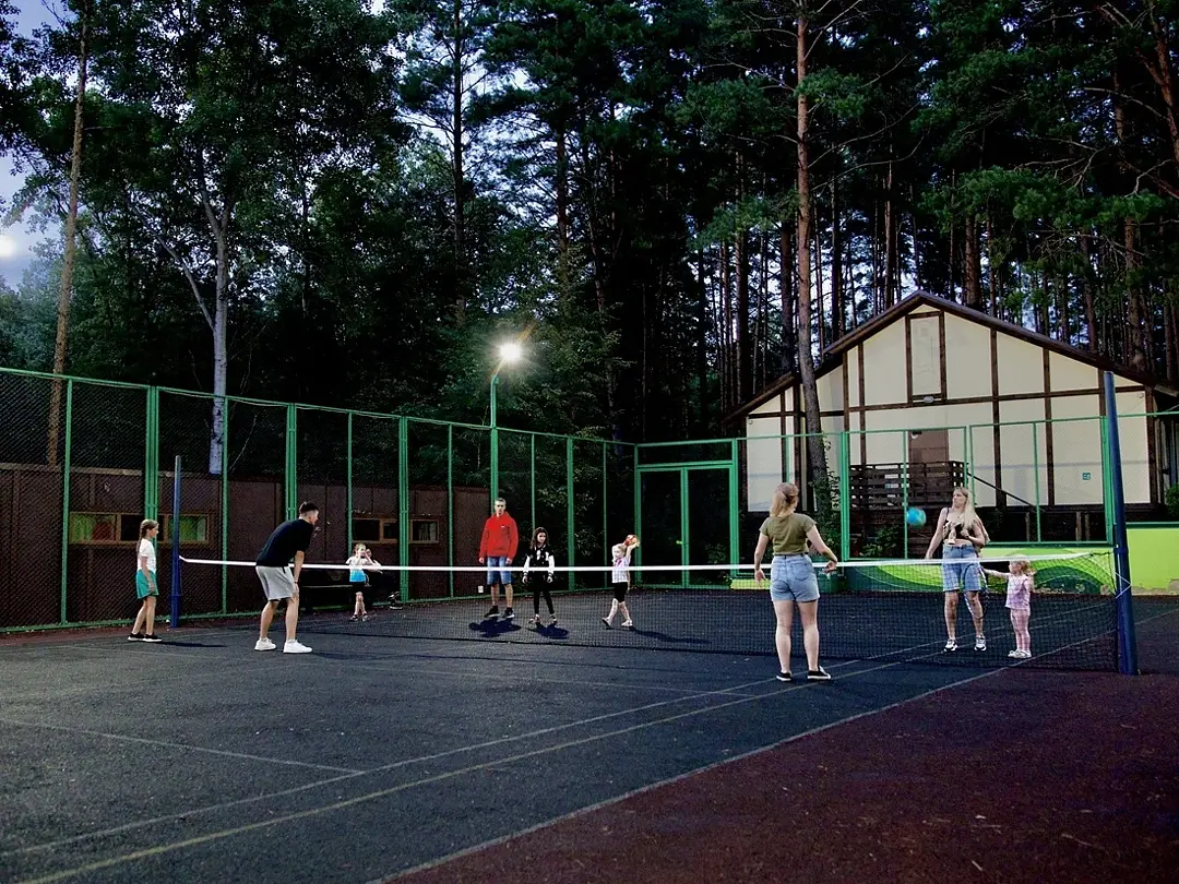 На территории клуба есть открытый подогреваемый бассейн, русская баня, беседка с мангалами, летняя веранда, детский городок и спортивная площадка.