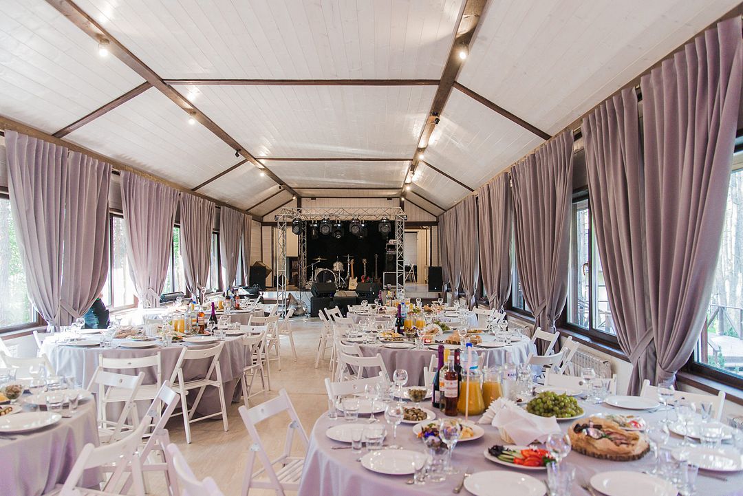 Имеется импровизированная сцена для выступления приглашенных артистов. Рядом располагается невероятно красивая площадка для проведения выездной регистрации.