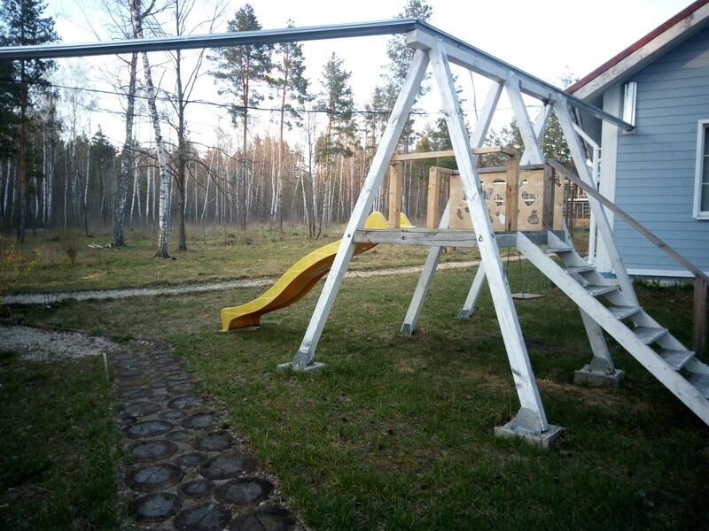 Для маленьких гостей на территории оборудована детская площадка с горкой и качелями