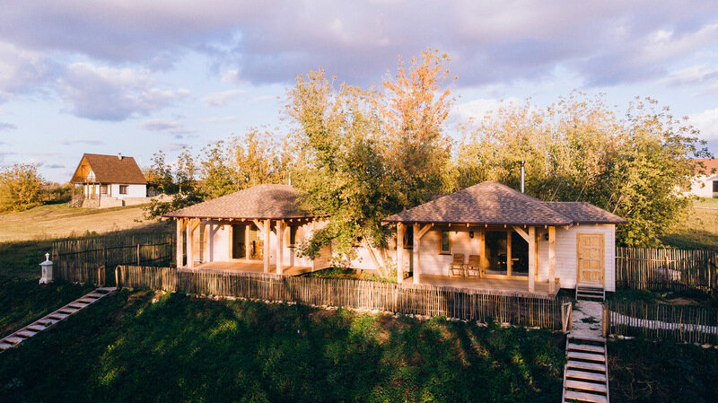 Для размещения гостей представлены комфортные коттеджи, которые оформлены в деревенском стиле и передают уютную атмосферу светлой мебелью и стенами. В каждом из них есть камин, караоке, и терраса. Гости могут организовывать свое питание самостоятельно, в каждом домике имеется полностью оборудованная кухня. Также у Вас есть возможность попробовать настоящее парное молоко, хлеб из печки, французское вино из погреба.