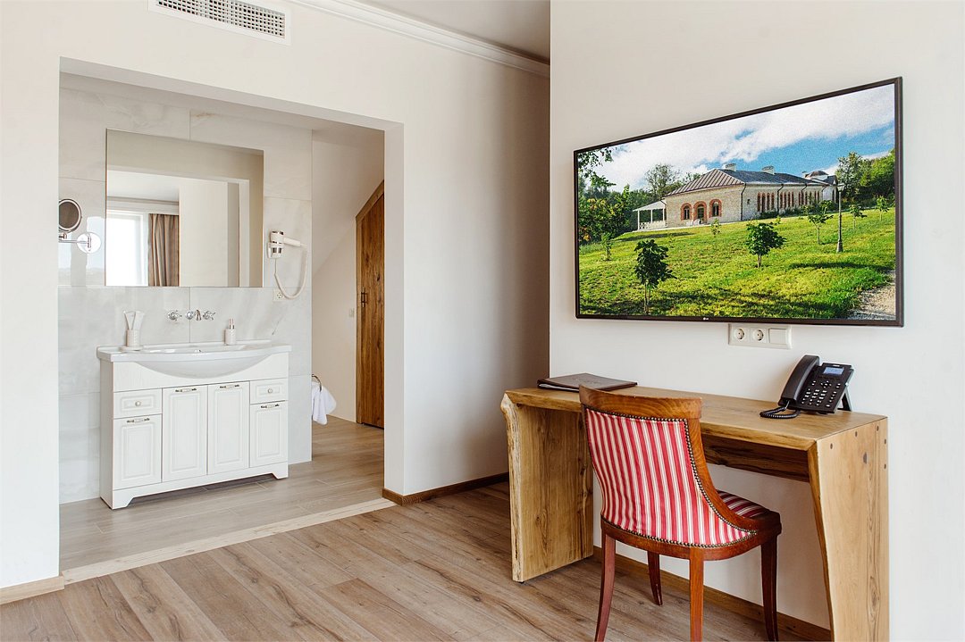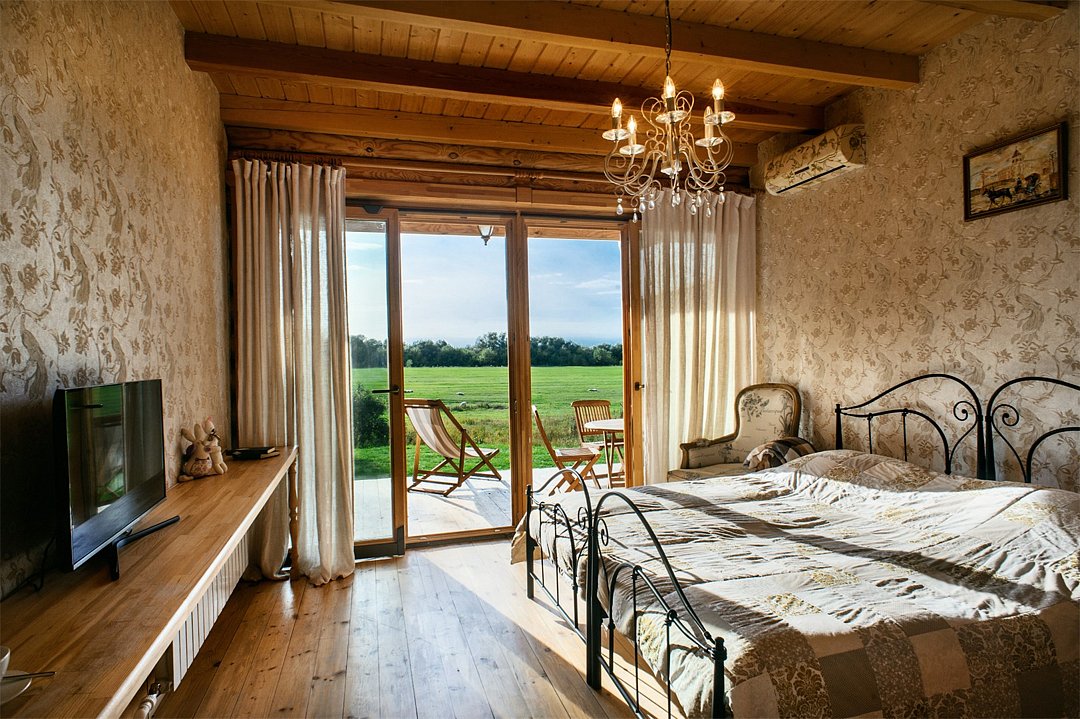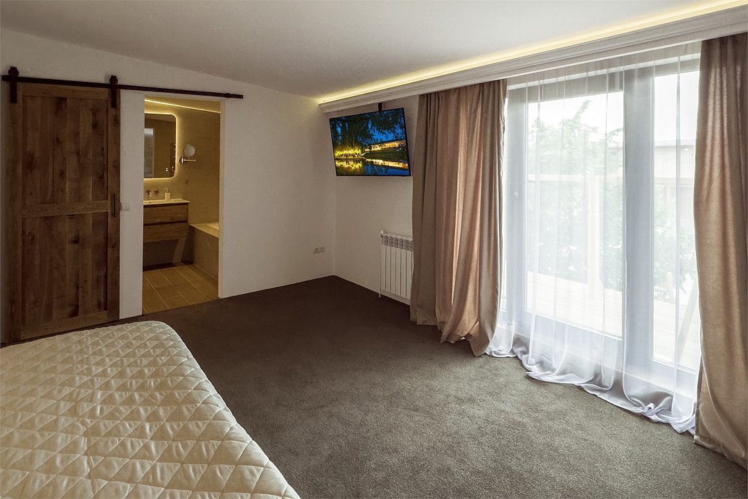 Вместимость номера до 3-х гостей (двухспальная кровать 180сх200см + раскладная кровать 80х200см за дополнительную плату). Номер расположен в восстановленной крепости XIX века на первом этаже. Панорамное окно с выходом на большую площадку для барбекю с уличной мебелью. Размещение с домашними животными в номерах данной категории запрещено.Услуги и удобства