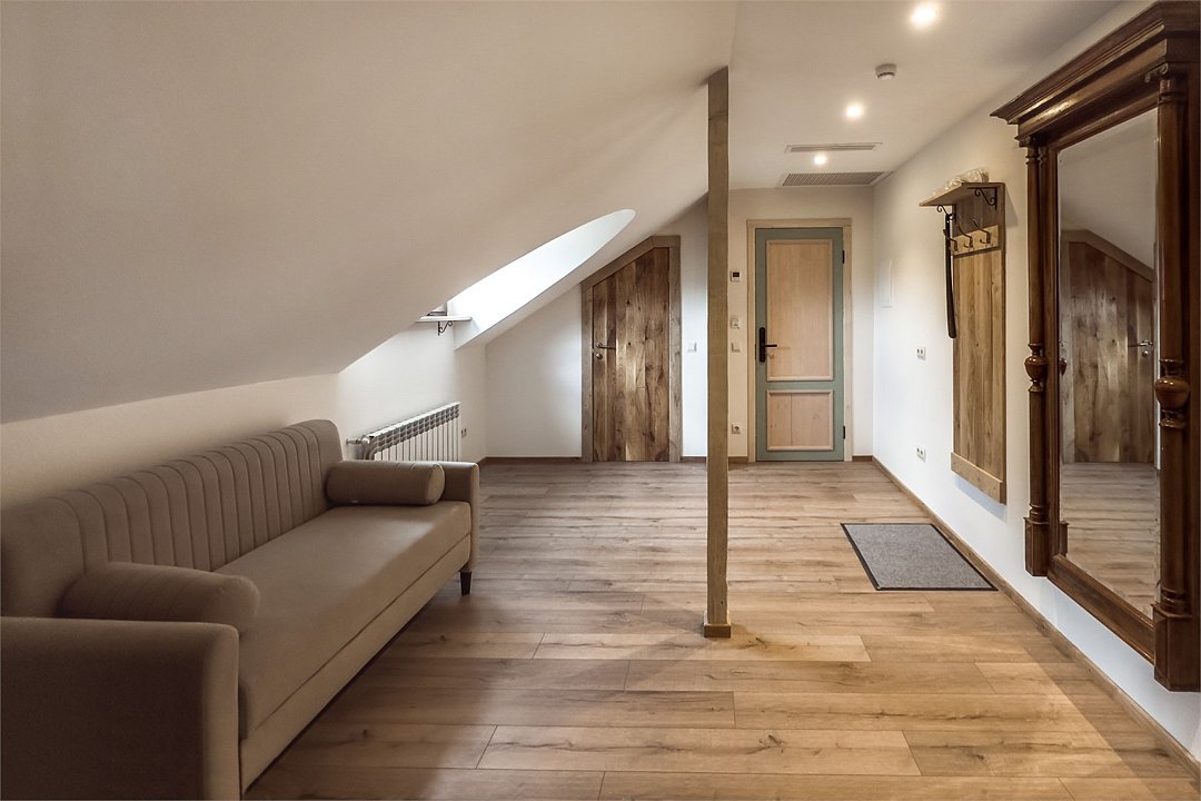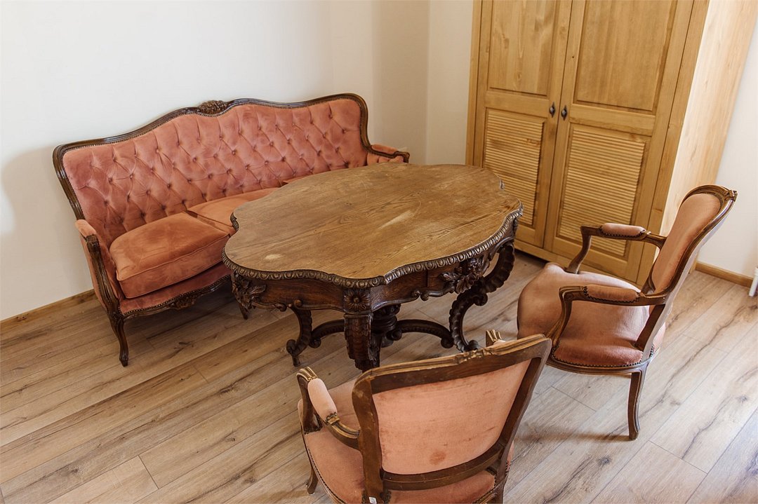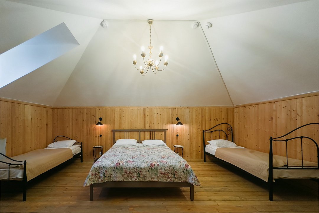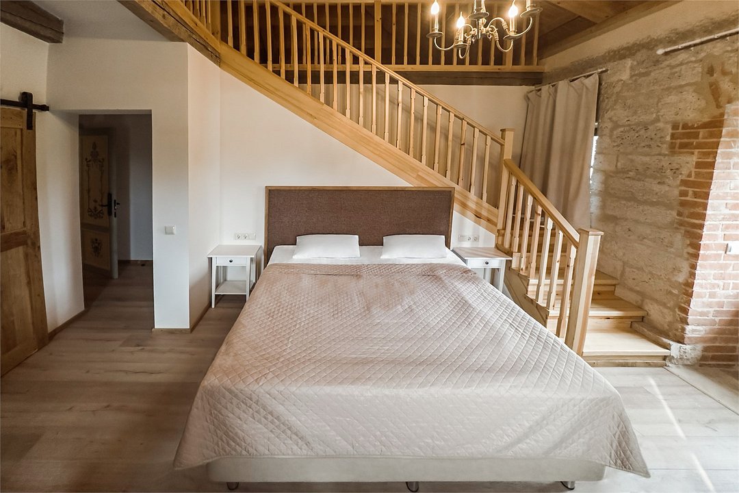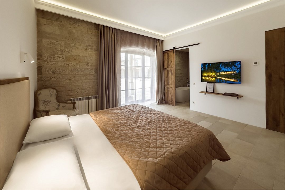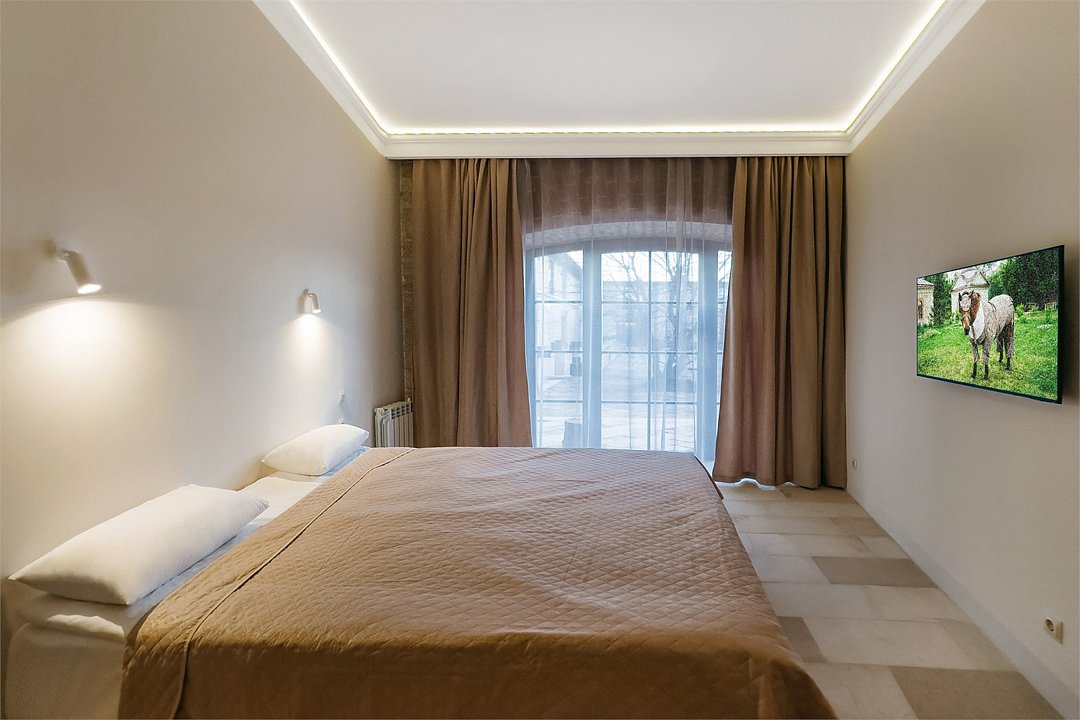 Вместимость номера до 6 гостей (двухспальная кровать 180сх200см в спальной + две односпальные кровати 90х200см во второй спальной + раскладной диван 140х200см в гостиной за дополнительную плату). Номер расположен в восстановленной крепости XIX века на втором этаже. Панорамное окно с видом во внутренний дворик и выходом на балкон. Размещение с домашними животными в номерах данной категории запрещено.Услуги и удобства