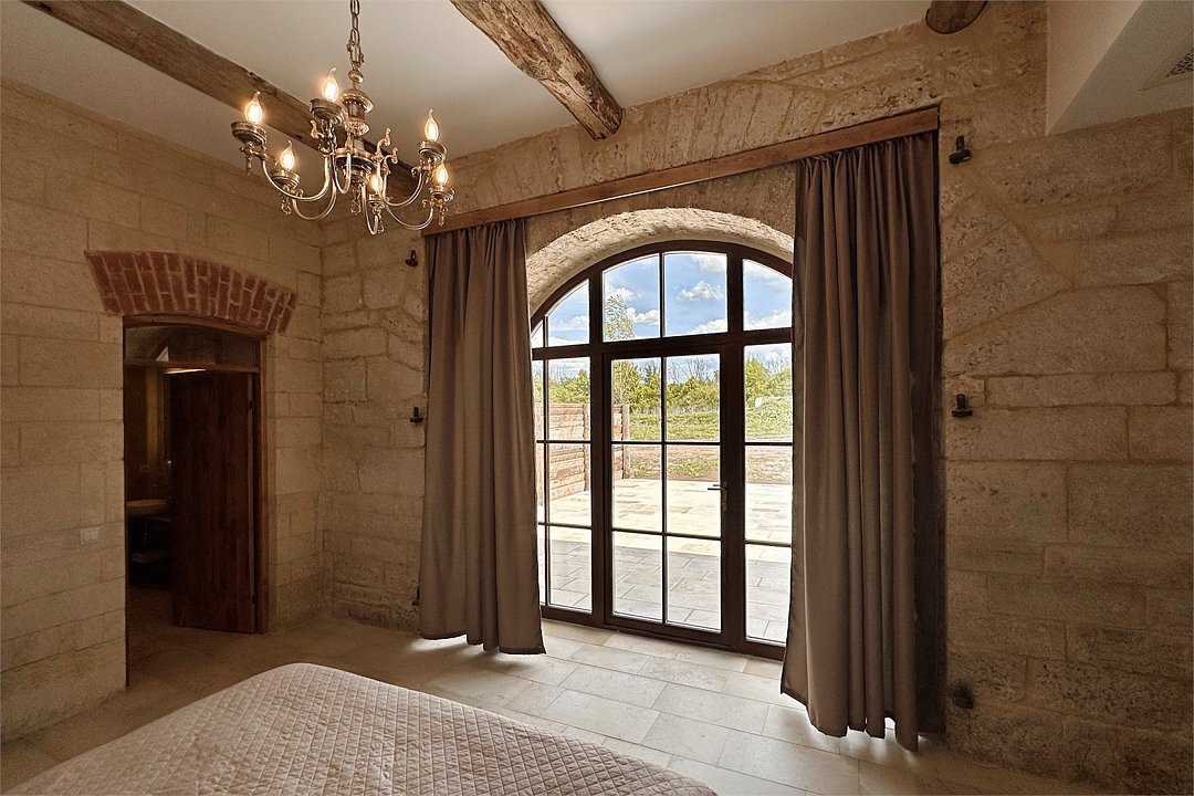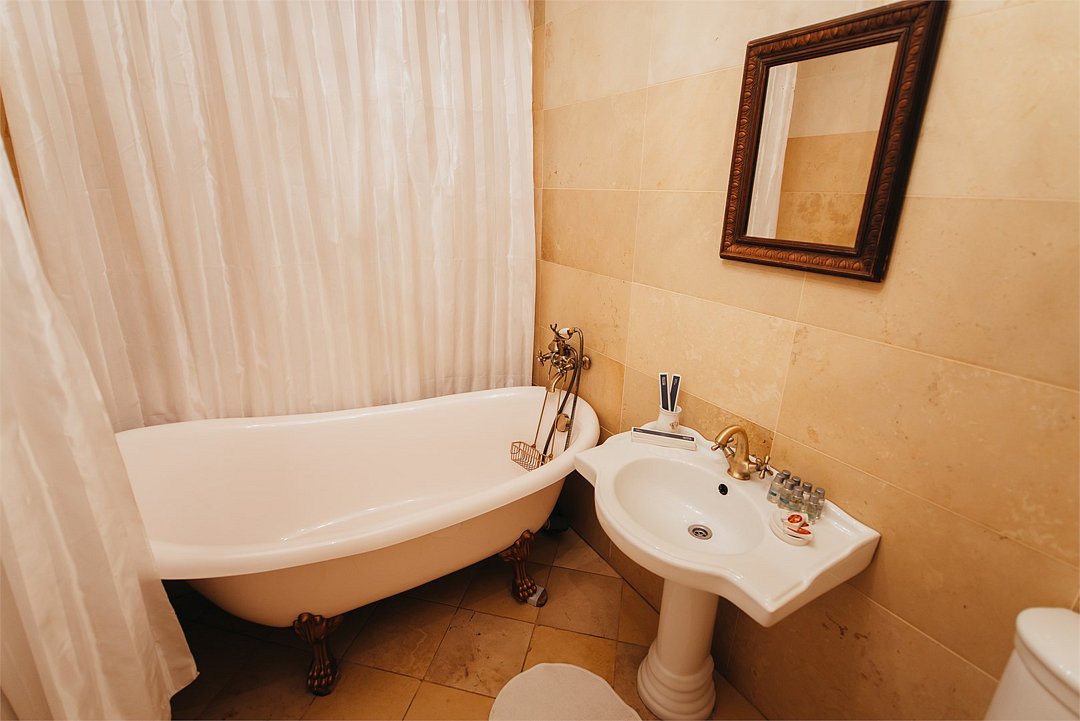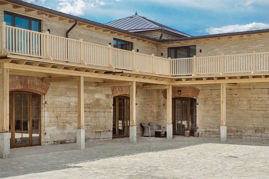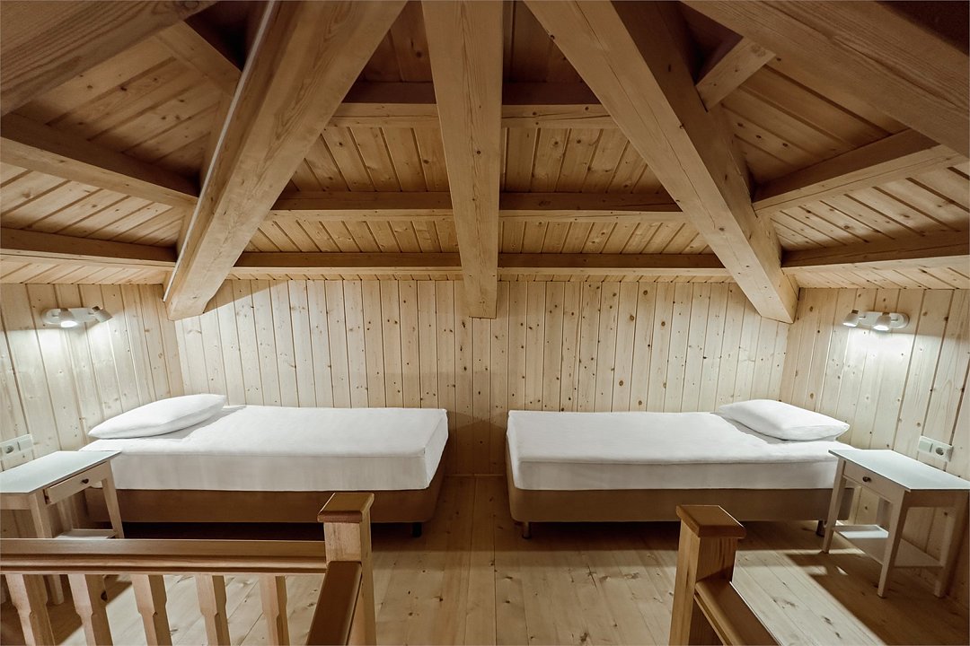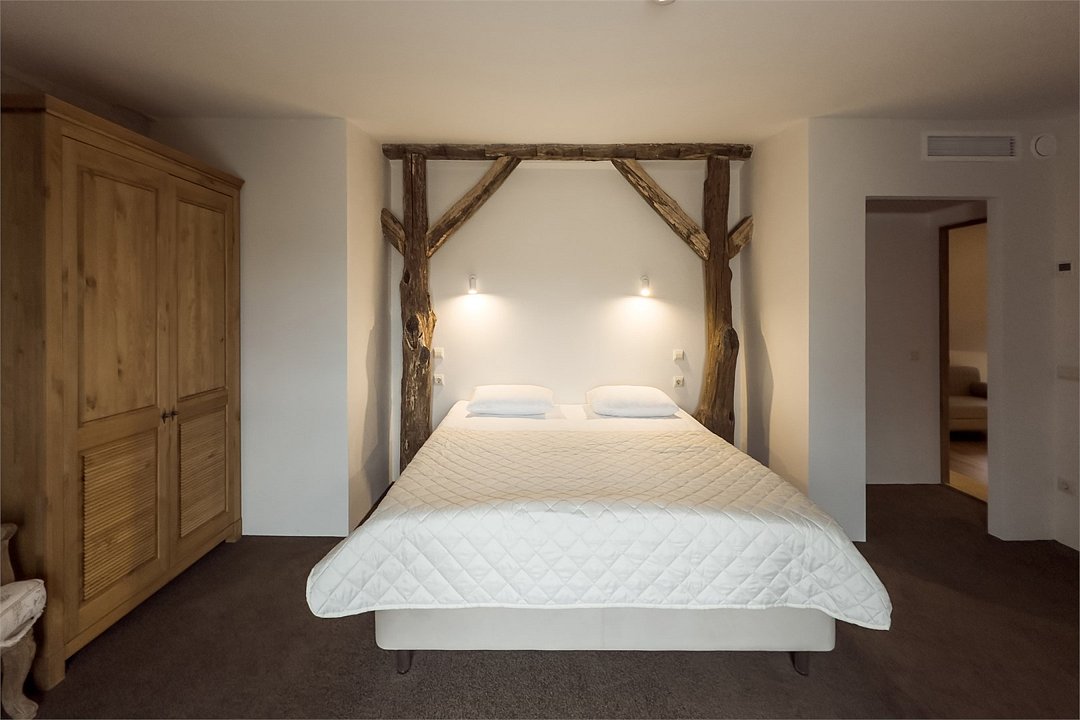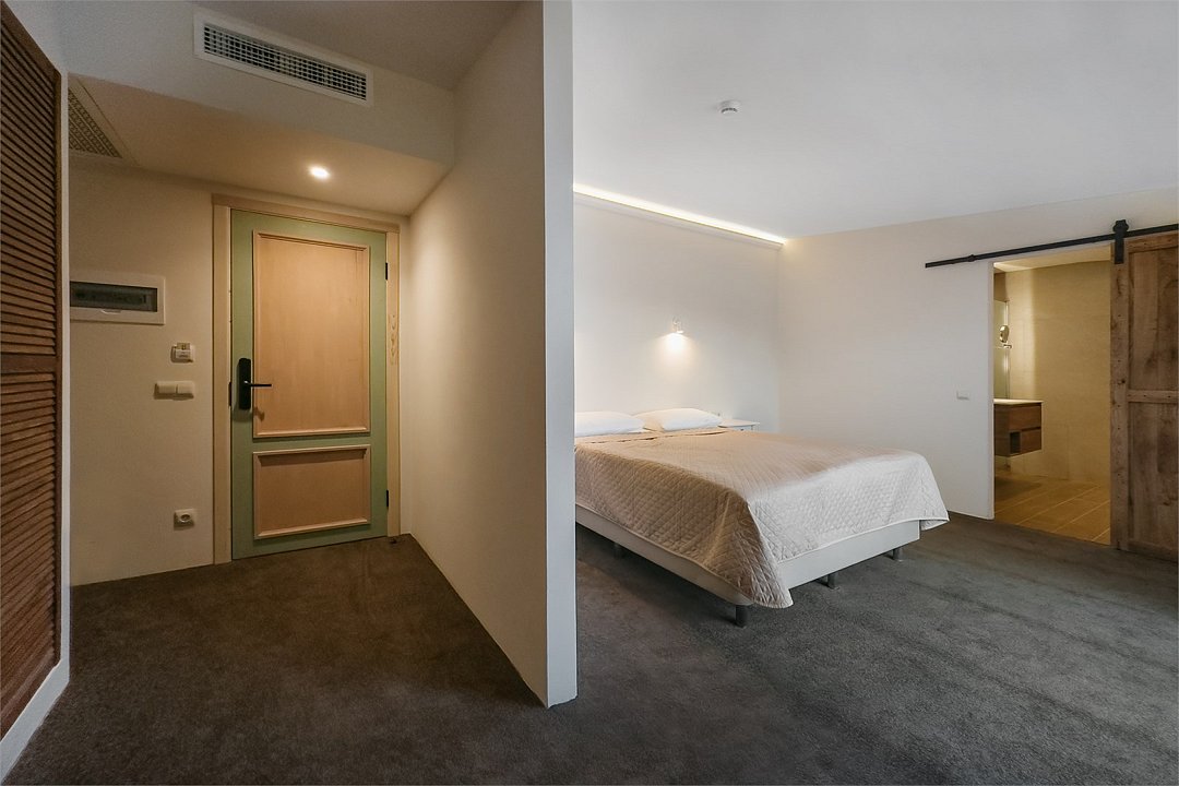 Вместимость номера до 6 гостей (двухспальная кровать 180сх200см в спальной + две односпальные кровати 90х200см во второй спальной + раскладной диван 140х200см в гостиной за дополнительную плату). Номер расположен в восстановленной крепости XIX века на втором этаже. Панорамное окно с видом во внутренний дворик и выходом на балкон. Размещение с домашними животными в номерах данной категории запрещено.Услуги и удобства