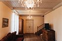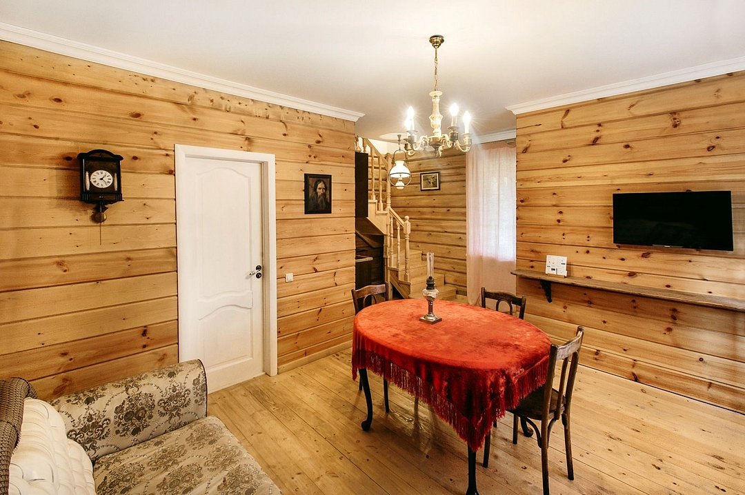 Размещение до 6 гостей ( 4 гостя на двухспальных кроватях и 2 на евро раскладушках в гостиной на первом этаже). Дом с мезонином представляет собой общий дом, разделенный на два крыла. В доме имеется смежная комната - прихожая. При аренде дома целиком, проходную дверь можно использовать для перемещения гостей правого и левого крыла внутри дома. На первом этаже левого крыла расположены гостиная с антикварной мебелью, диваном и камином, обеденная зона, небольшая кухня с современным оборудованием и умывальная комната с ванной. На втором этаже две спальни, оборудованные кондиционером, в каждой стоит двуспальная кровать, одна спальня проходного типа. В гостиной есть большой телевизионный экран с выбором каналов и возможностью смотреть фильмы из нашей видеотеки. В распоряжении гостей левого крыла дома находится дворик с оборудованной мангальной площадкой, летней мебелью и видом на главную аллею. В доме есть спутниковое телевидение, wi-fi, чайная станция, минеральная вода, антикварная мебель.Услуги и удобства