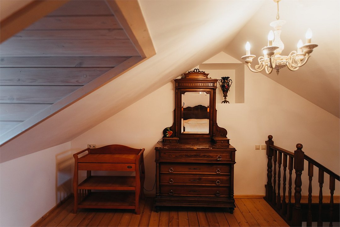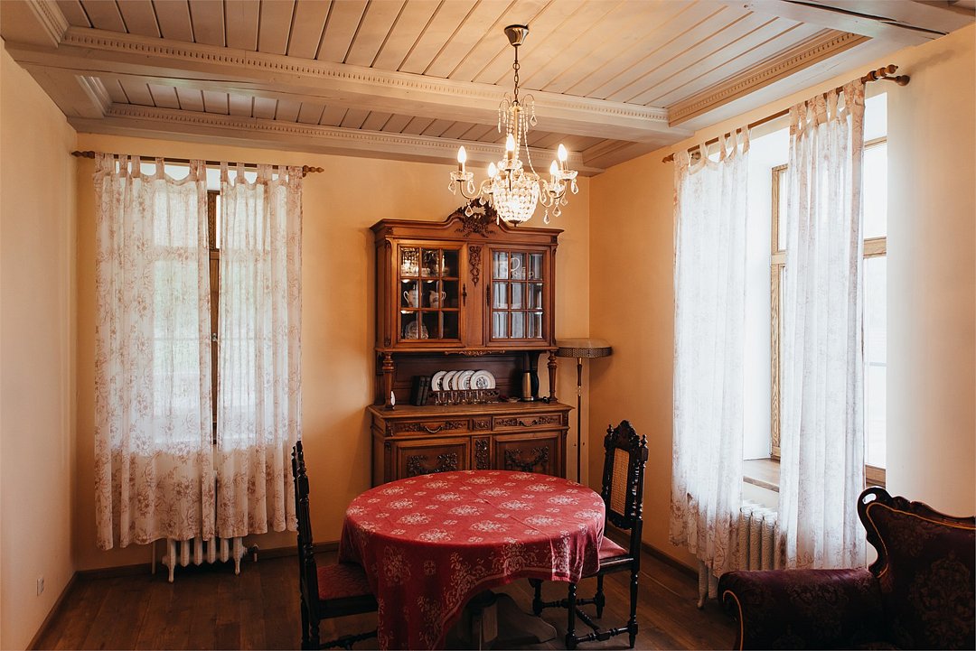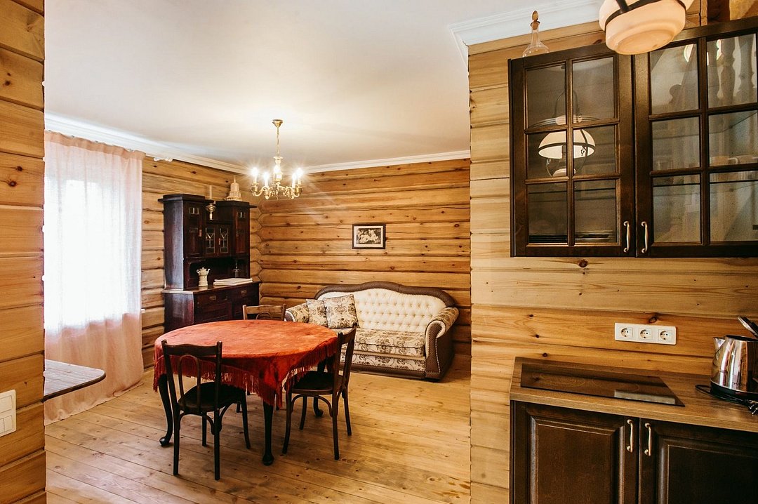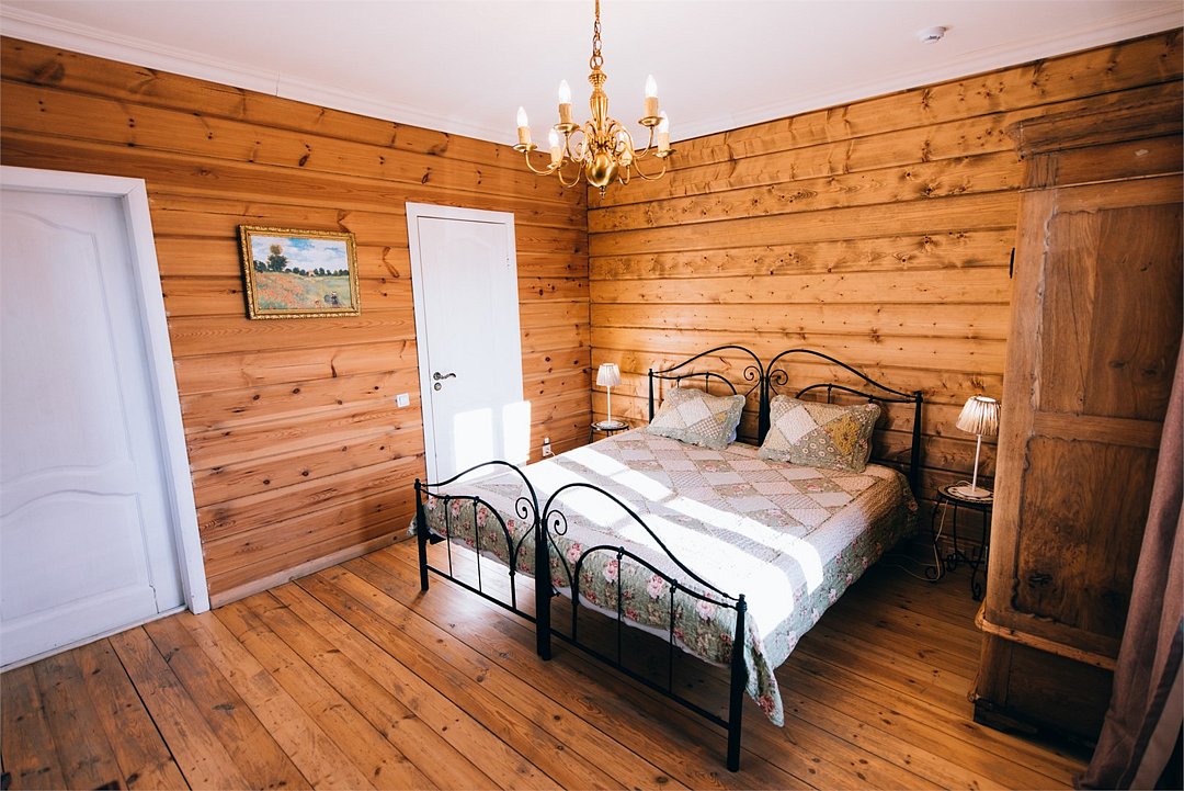 Господский дом Размещение до 2 семей (2 спальни с двуспальными кроватями и детская комната с 2 раздельными кроватями и 1 двухъярусной, по запросу можно добавить 2 места на двухъярусной кровати). Главный дом располагается в восстановленном правом флигеле барского дома. На первом этаже расположены гостиная и столовая с антикварной мебелью, небольшая кухня с современным оборудованием и умывальная комната с ванной. На втором этаже спальня, в которой стоит двуспальная кровать, кабинет, в котором стоит софа раскладывающаяся в полноценную двуспальную кровать, и детская комната, в которой 2 раздельные кровати и 1 двухъярусная. На втором этаже есть небольшой санузел. В гостиной большой телевизионный экран с выбором каналов и возможностью смотреть фильмы из нашей видеотеки. В доме есть спутниковое телевидение, wi-fi, чайная станция, минеральная вода, антикварная мебель.Услуги и удобства