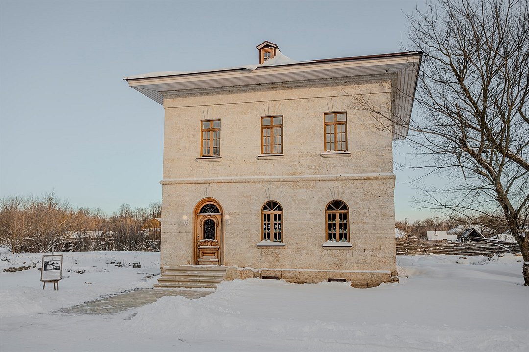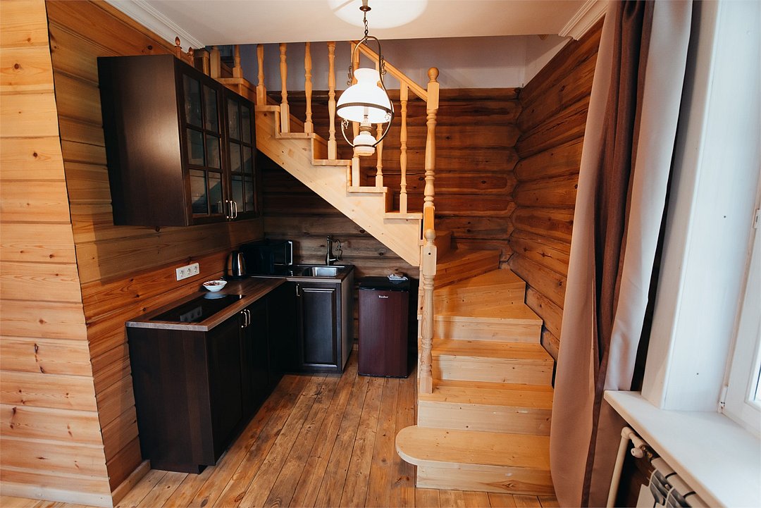 Вместимость: до 4 гостей (Одна двухспальная кровать и две односпальных в спальне на втором этаже). Двухэтажный номер во флигеле "Школа", площадью 40 кв.м., построен на фундаменте исторической дворовой избы времен Муравьева-Карского.Услуги и удобства