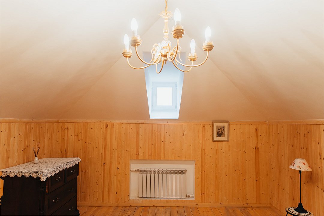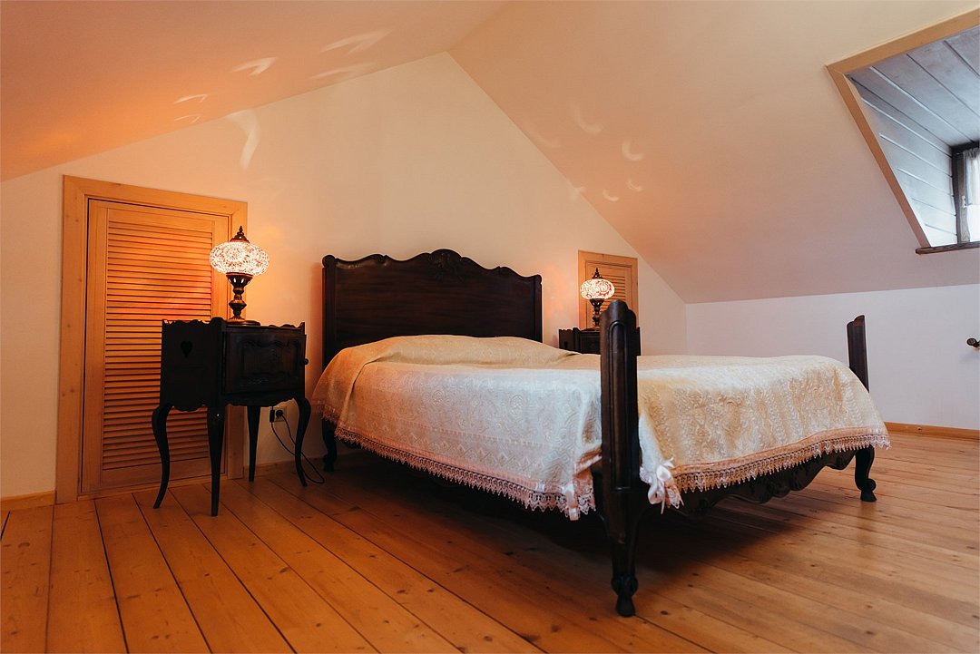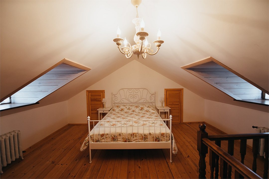 Размещение до 4 гостей ( 2 гостя на двухспальной кровати и 2 на дополнительных евро раскладушках в гостиной на первом этаже). Дом с мезонином представляет собой общий дом, разделенный на два крыла. В доме имеется смежная комната - прихожая. При аренде дома целиком, проходную дверь можно использовать для перемещения гостей правого и левого крыла внутри дома. Так же, правое крыло имеет отдельный вход с уличной стороны, оснащенный большой летней верандой и уличной мебелью. На втором этаже расположена двуспальная кровать. Спальная комната оборудована кондиционером. В гостиной на первом этаже есть возможность добавить дополнительные спальные места. В гостиной большой обеденный стол. Умывальная комната с ванной. В доме есть спутниковое телевидение, wi-fi, чайная станция, минеральная вода, антикварная мебель.Услуги и удобства