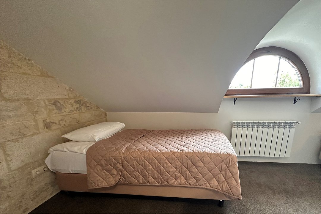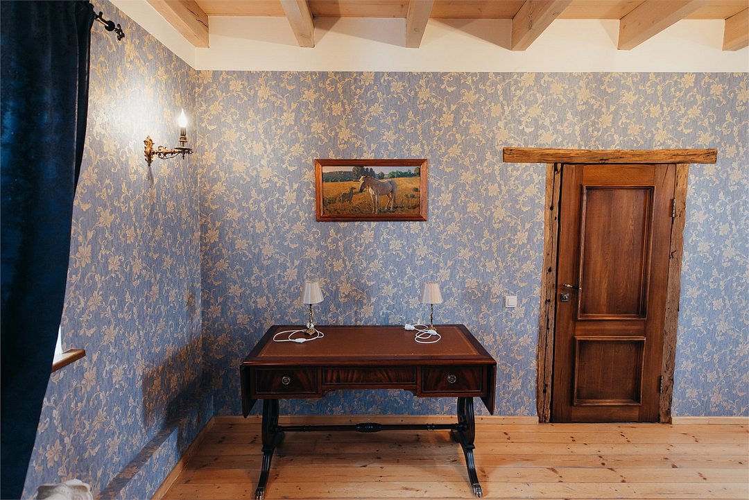 Вместимость номера до 4-х гостей (двухспальная кровать 180сх200см + две односпальных кровати 90х200см на полуэтаже за дополнительную плату). Номер расположен в восстановленной крепости XIX века на втором этаже. Вид из номера на аллею. Размещение с домашними животными в номерах данной категории запрещено.Услуги и удобства