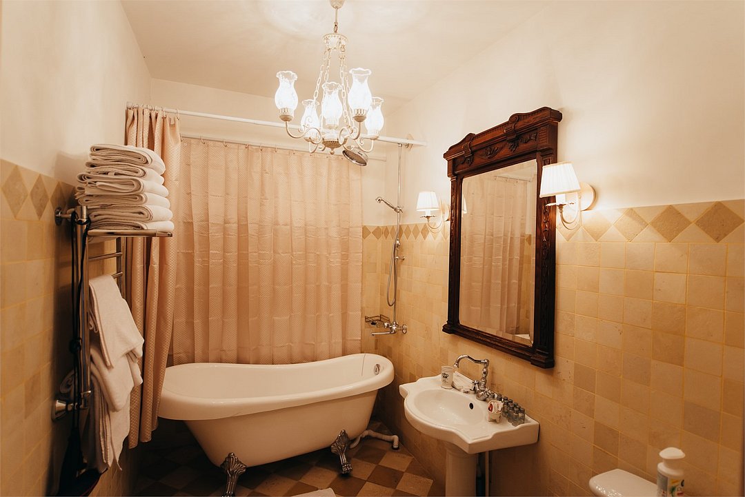 Вместимость номера до 4-х гостей (двухспальная кровать 180сх200см + раскладной диван 140х200см за дополнительную плату). Номер расположен в восстановленной крепости XIX века на первом этаже, имеет оборудованную кухню и обеденную зону. Панорамное окно с выходом на большую площадку для барбекю с уличной мебельюУслуги и удобства
