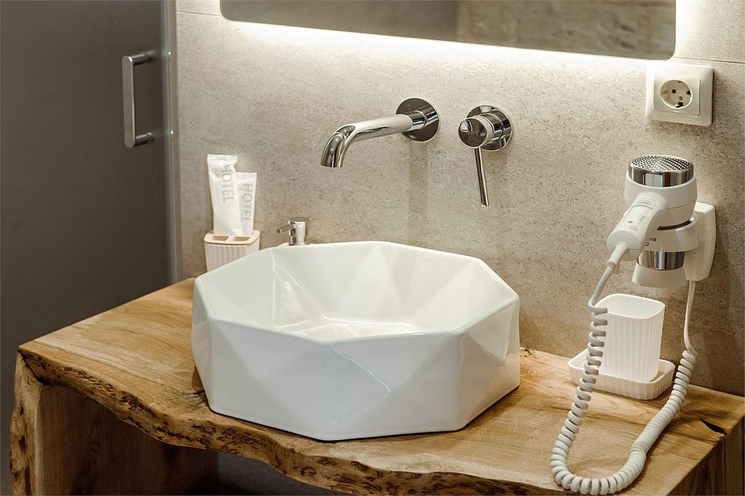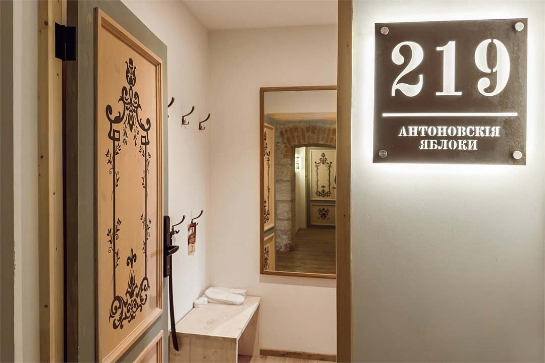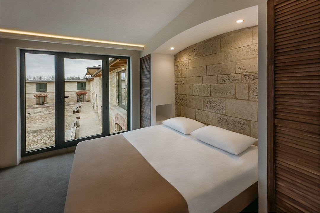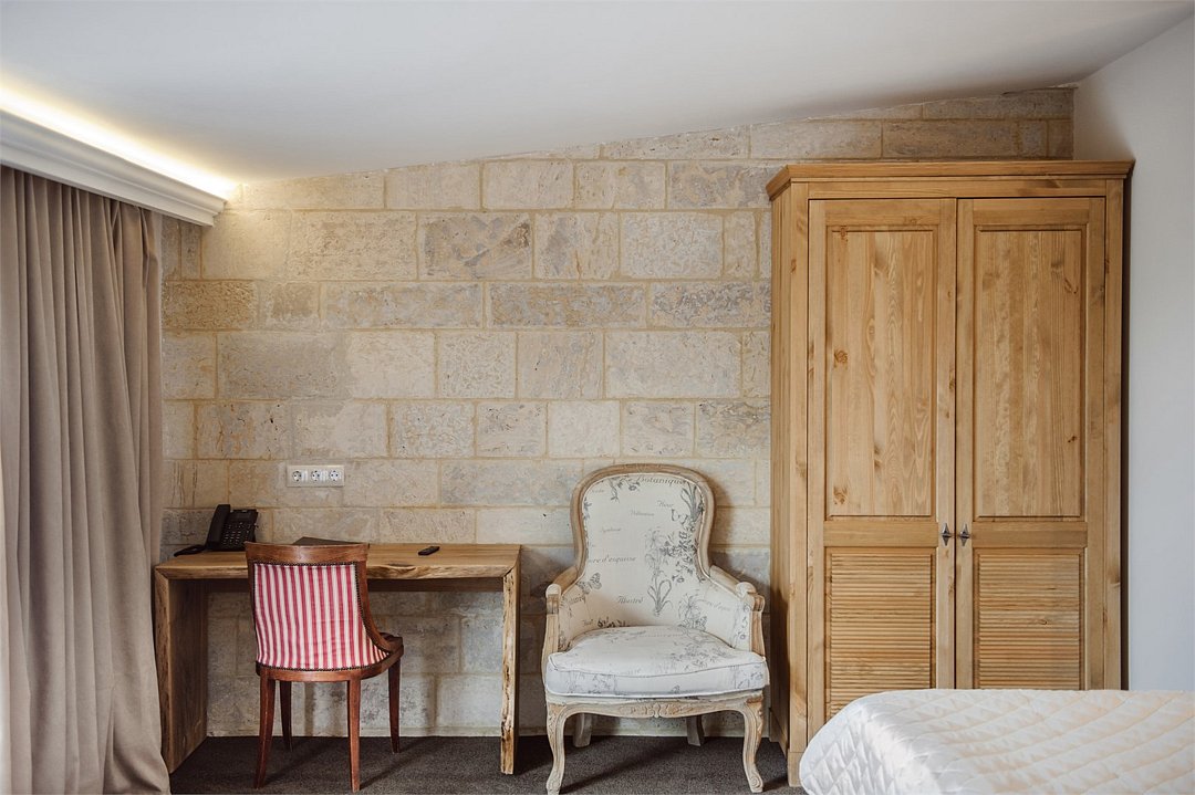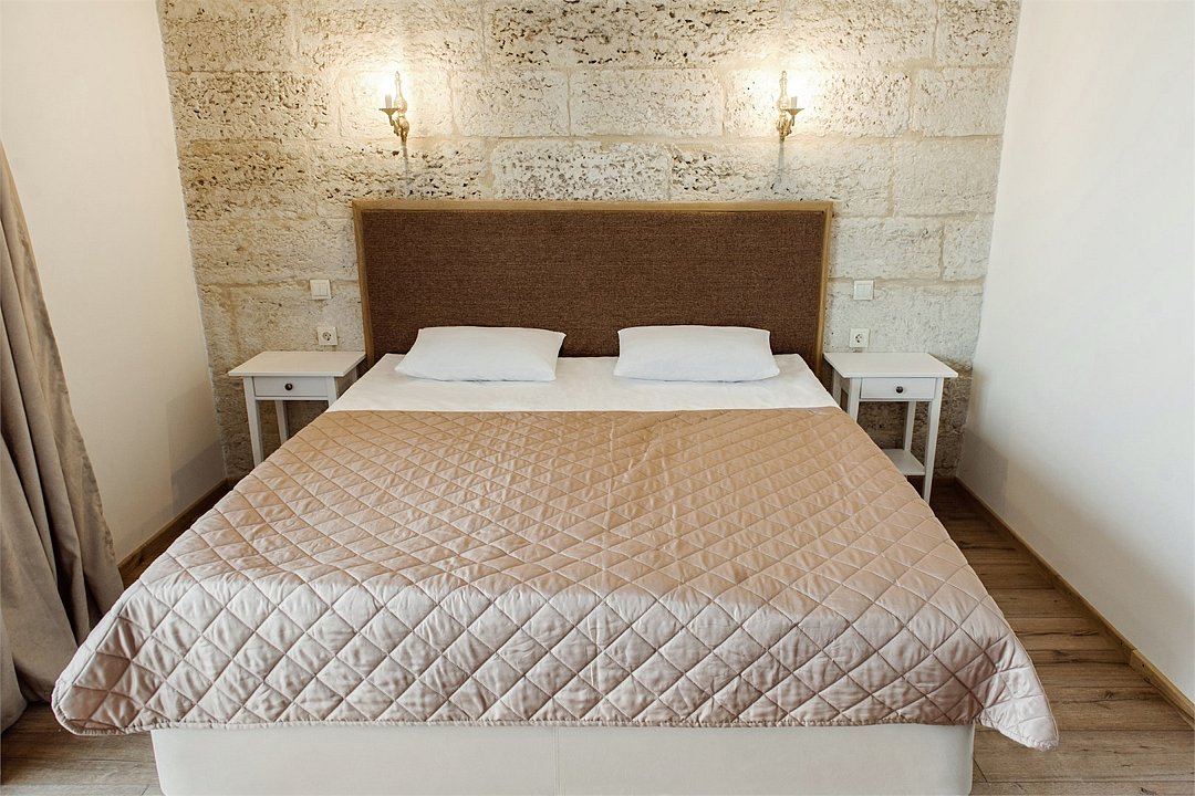 Вместимость номера до 4-х гостей (двухспальная кровать 180сх200см + раскладной диван 140х200см за дополнительную плату). Номер расположен в восстановленной крепости XIX века на первом этаже. Панорамное окно с видом во внутренний дворик и уличной мебелью. Номера одной категории имеют небольшие отличия ввиду исторических планировок. Размещение с домашними животными в номерах данной категории запрещено.Услуги и удобства