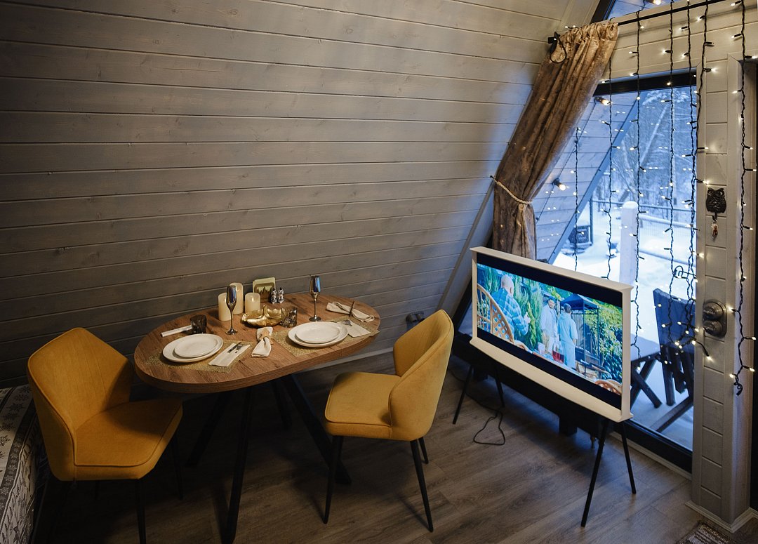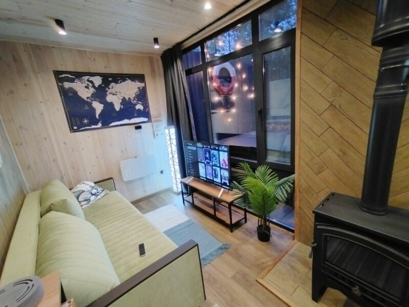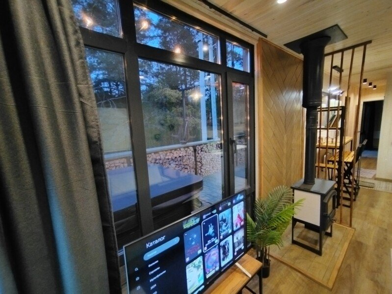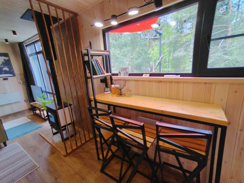 В доме отдельная спальня с панорамными окнами в пол, санузел с душевой кабиной, кухня-гостиная с барной стойкой, камином и диваном, терраса перед контейнером 34 м² с шикарным видом на заказник, джакузи, чилл-зона и барная стойка на террасе, два спальных места 140х200.