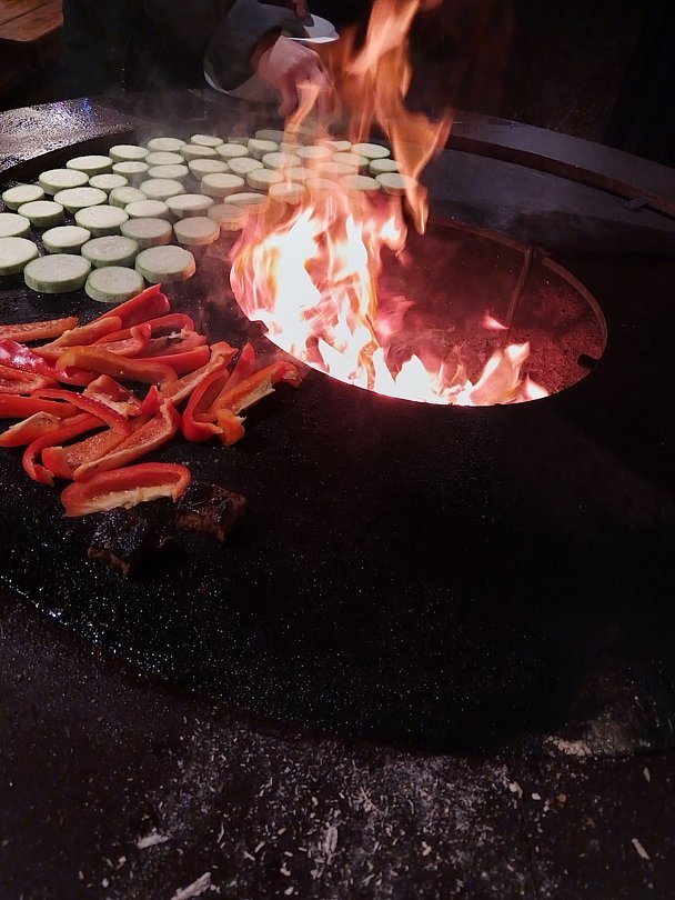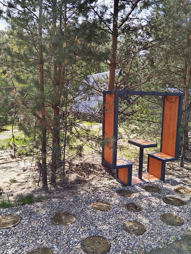 На живописной территории глэмпинга расположена уютная общая беседка, где можно собраться всей семьей. В центре внимания — уникальный гриль, выполненный в виде толстого металлического блина, который раскаляется от дров.