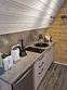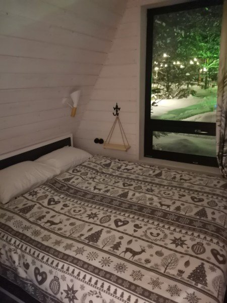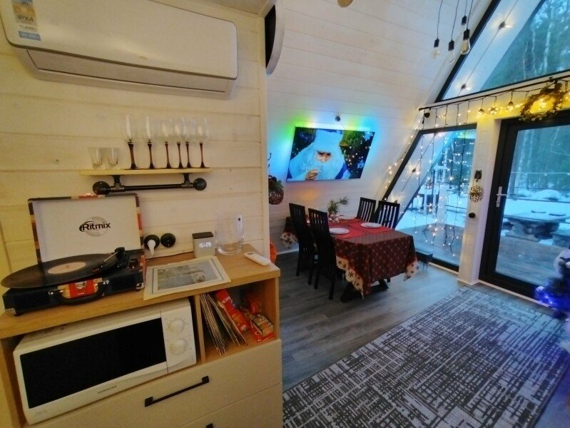 Дом 48 м² + 18 м² терраса. Изюминка дома – большая ванная у окна и кровать (160х200) с видом на лес. Размещение в один уровень: кровать 160х200, диван 140х200. Максимум 4 человека.