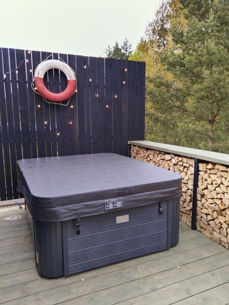 В непосредственной близости от уютного домика-контейнера находится джакузи, готовое подарить мгновения полного расслабления тем, кто решил выбрать именно этот дом для проживания. Это удовольствие становится идеальным дополнением к отдыху на природе, позволяя наслаждаться теплыми водами под звуки леса и пение птиц, создавая атмосферу уединения и гармонии.