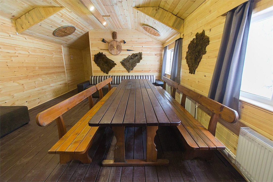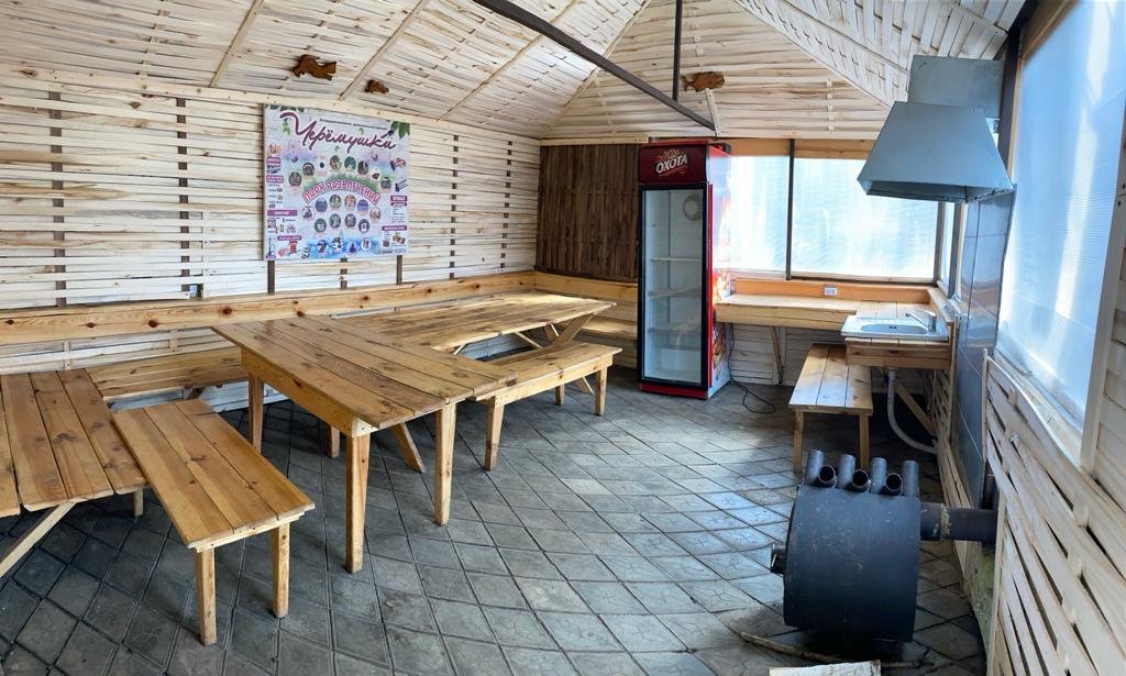 Беседка рассчитана на одновременное пребывание до двадцати человек. Внутри есть стол, стулья, холодильник и кухонная зона с раковиной. В холодное время года помещение можно обогреть печкой, что создает комфортные условия.
