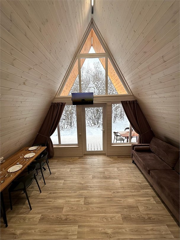Дом А-Frame №9 «Grand» с гидромассажной купелью и сауной! Комфорт в сердце природы Забудьте о городской суете и окунитесь в атмосферу умиротворения и безмятежности, выбрав отдых в А-Frame №9.